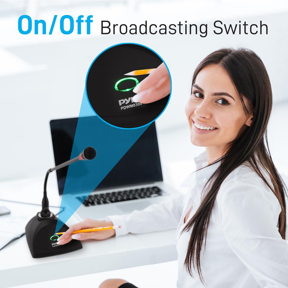 - Handsfree wireless desktop microphone system has 8 frequency channels and gives you 325 feet of operation range for cordless operation