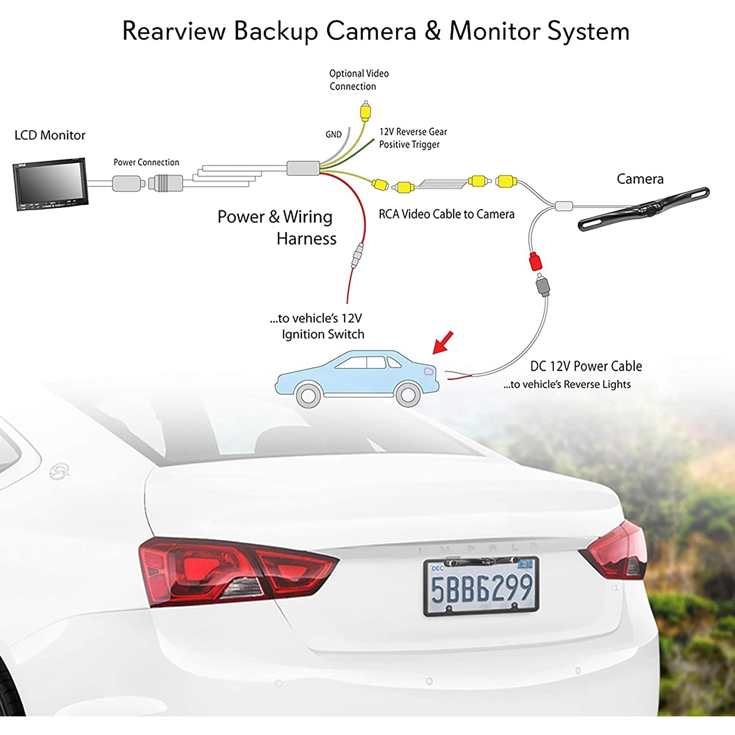 - Includes backup camera and monitor system, distance scale line display, and all necessary cables and wiring