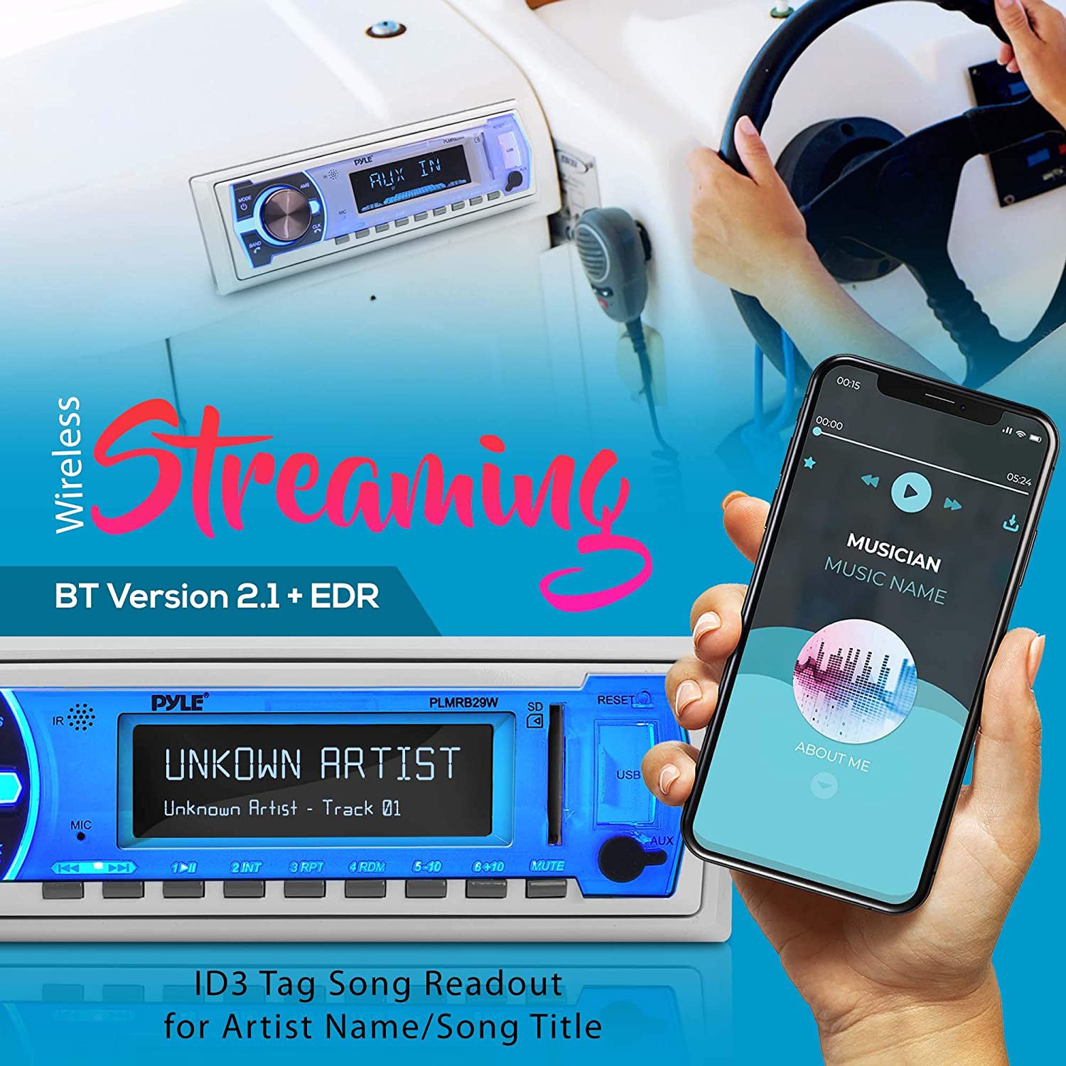 Add convenient, versatile, and wireless audio streaming ability while riding the waves with the Pyle Bluetooth Wireless In-Dash Stereo Radio Head Unit Receiver.