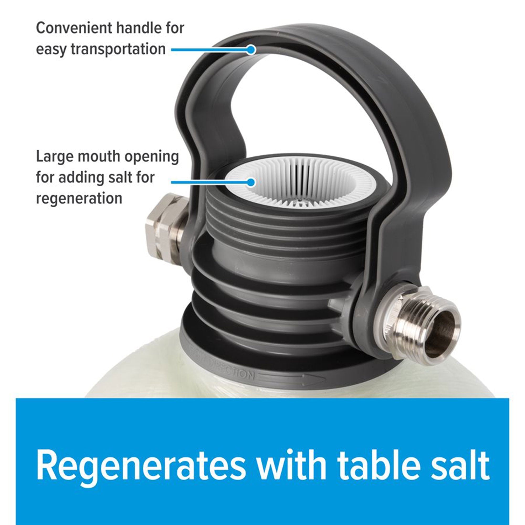 - Large mouth opening to effortlessly add 2 boxes of common table salt for regeneration (not included)