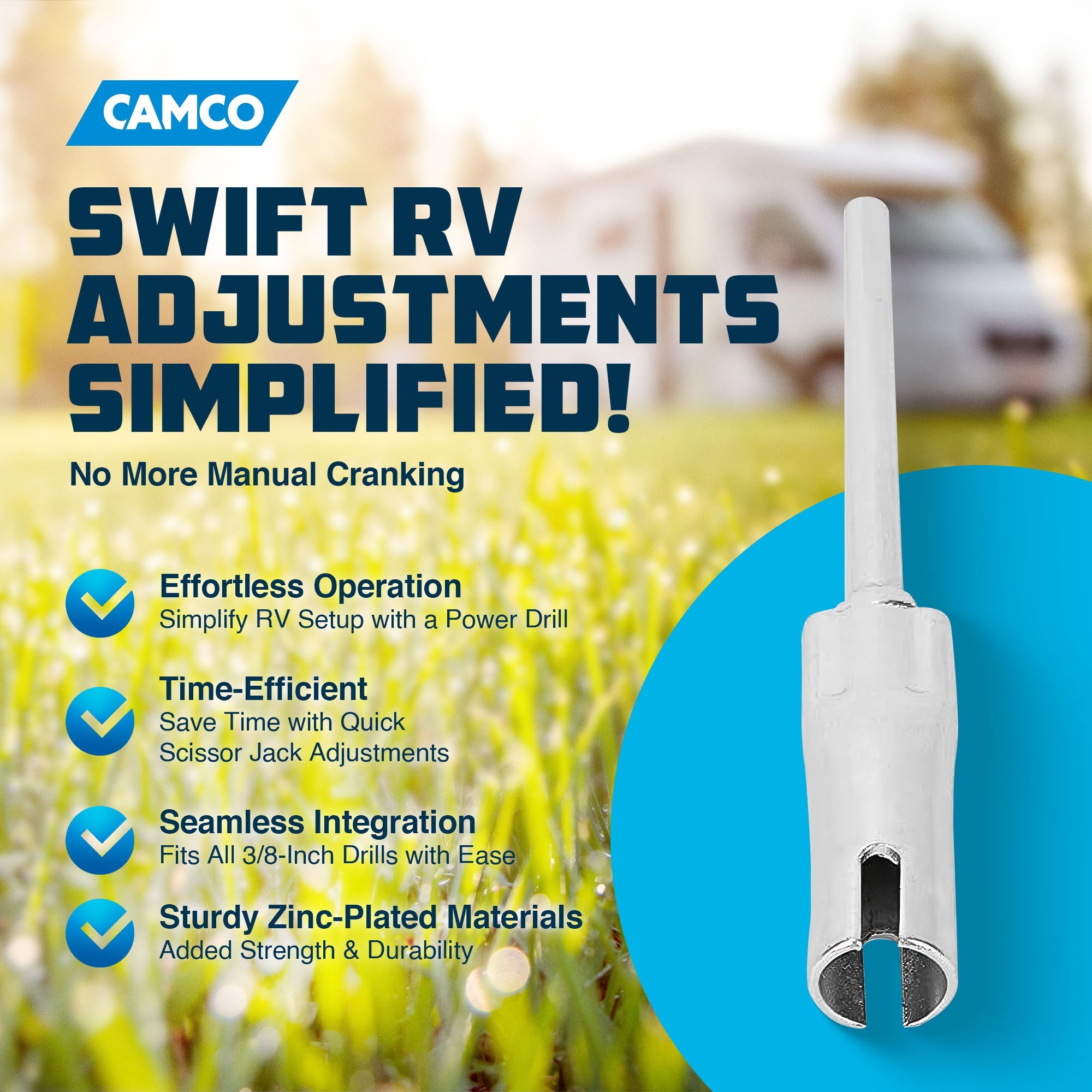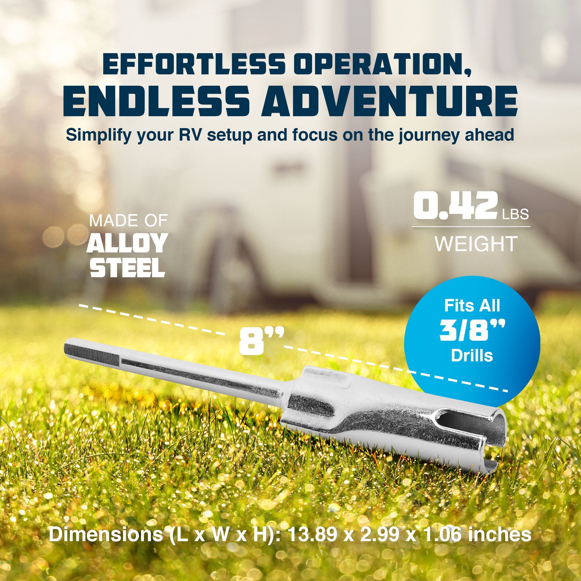 - Slotted drill attachment to effortlessly elevate your RV's scissor jacks, reclaiming valuable time for your adventures