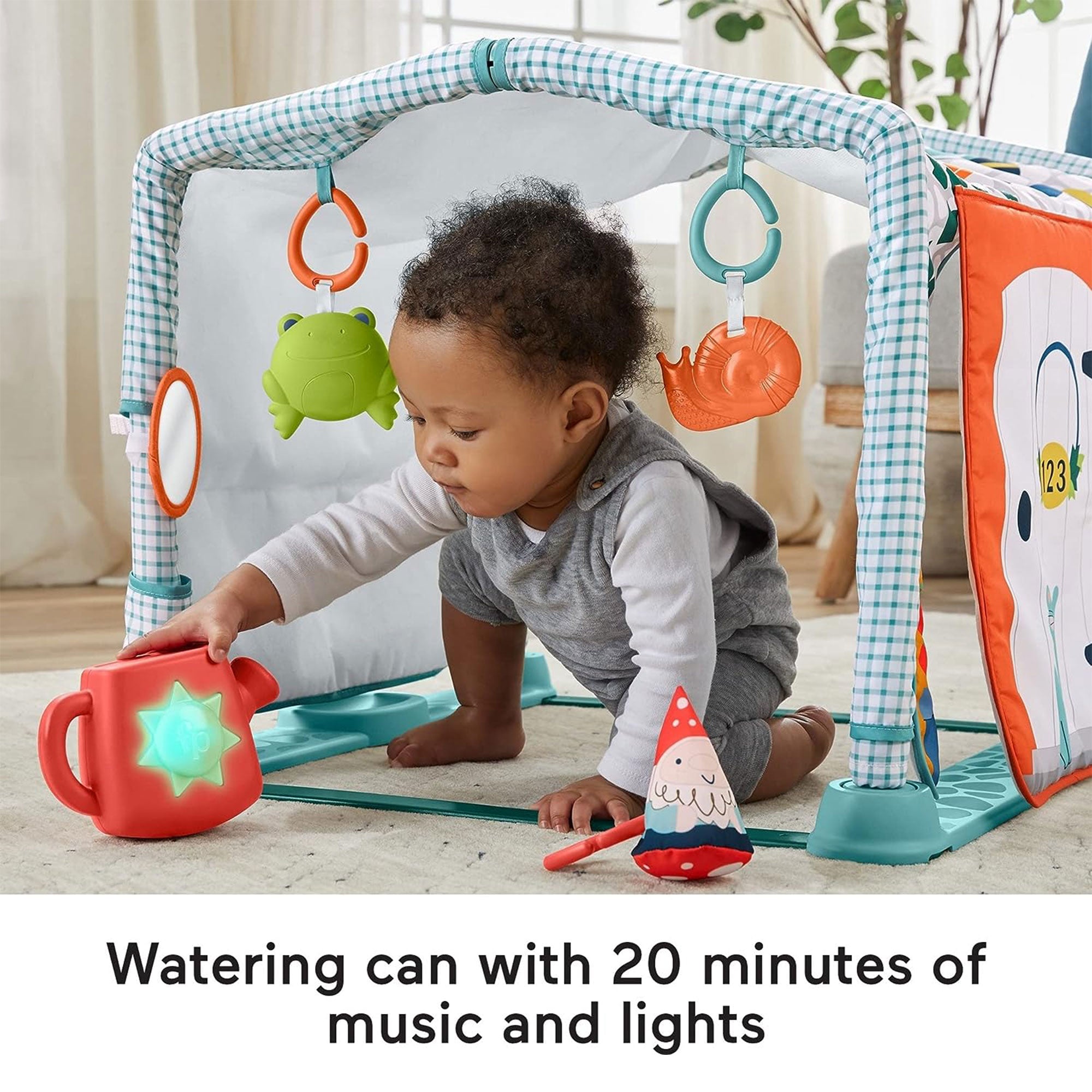 - Includes 5 engaging baby toys with a self-discovering mirror, frog rattle, snail teether, crinkle garden gnome, and roly-poly watering can