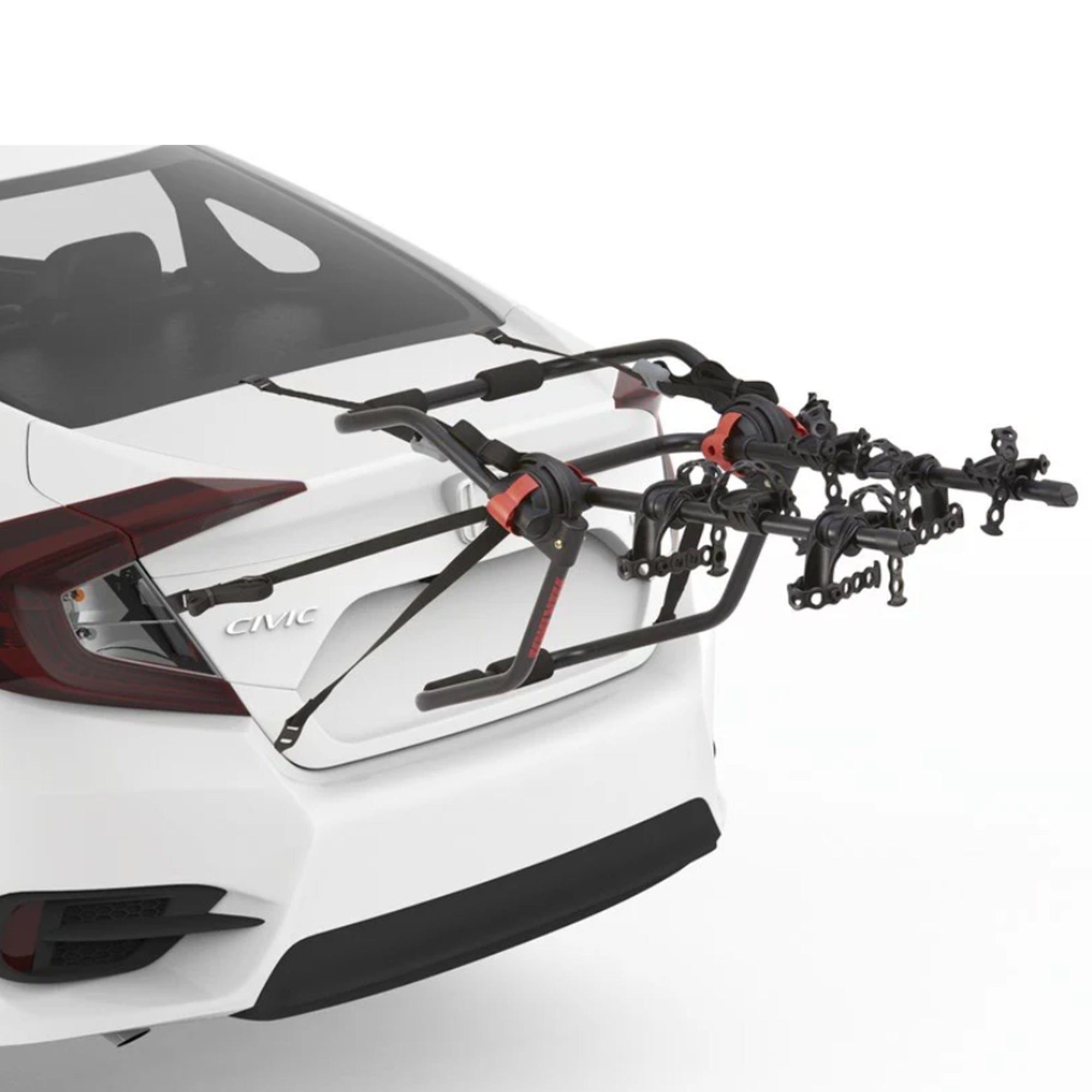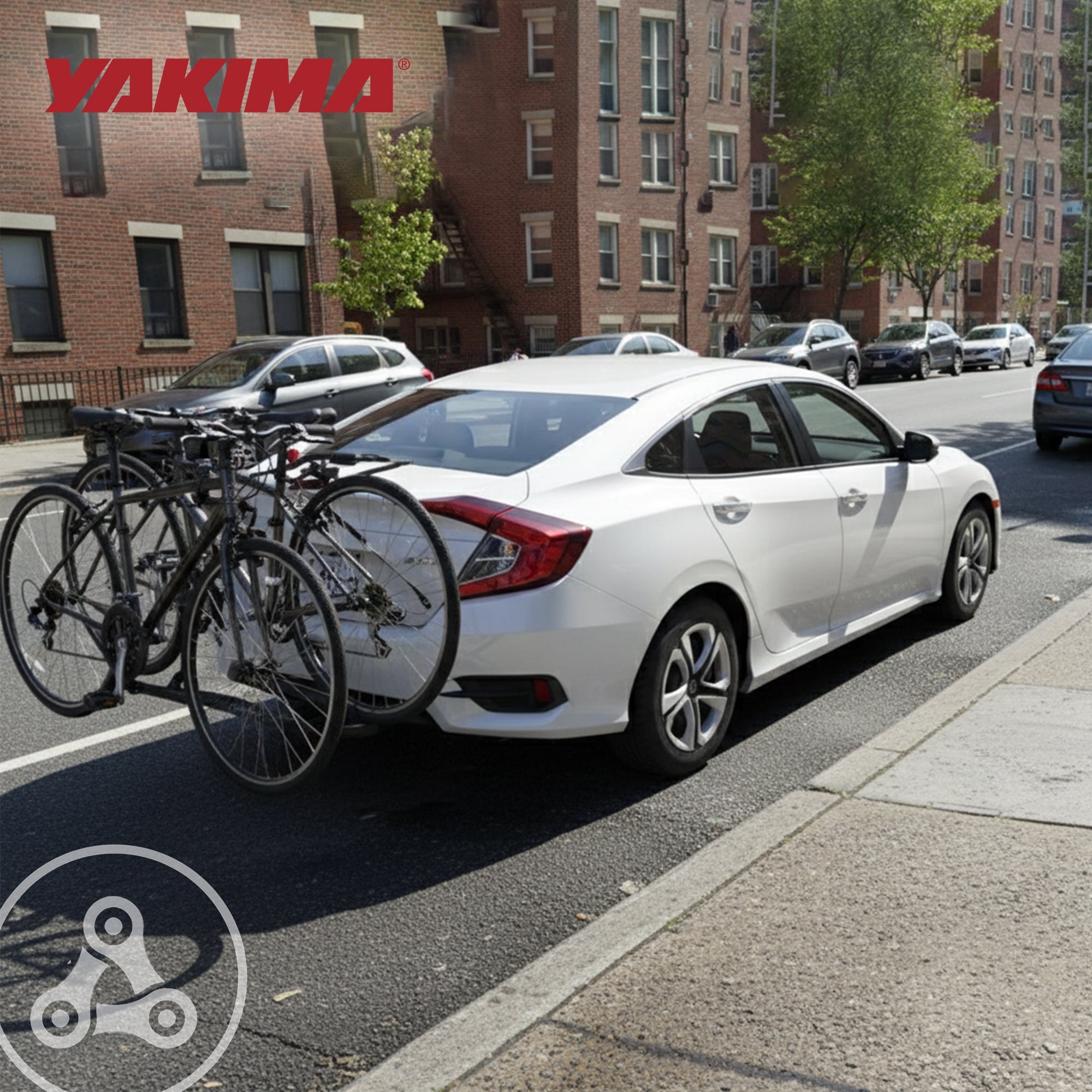 Hit the road with confidence and style while upgrading your cycling experience with the Yakima HangOut Car Trunk Compact Foldable 3-Bicycle Rack Carrier.