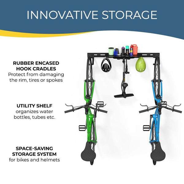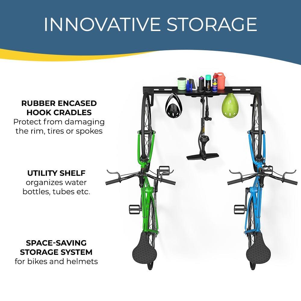 • VERSATILE - The 2-Bike Wall Mounted Bike Rack includes a hook/shelf combo to hang helmets and other accessories. No other wall mount bike rack system gives you this much flexibility.