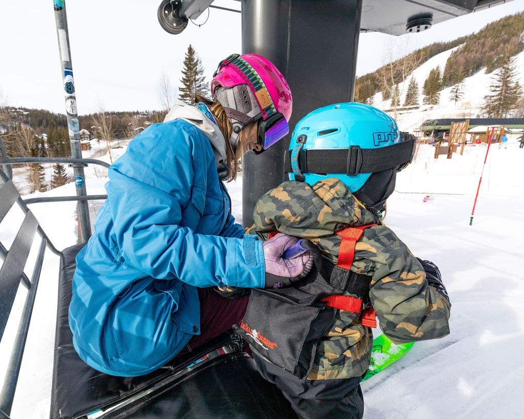 This teaching harness is ideal for kiddos 2 to 7 years old and will make for a safe and convenient ski trip. The Grip N' Guide handle is designed to help guide children onto the ski lift, and help lift them up after any slips or falls. Kids can easily learn to turn on their skis with the two removable 8-foot leashes so parents can guide them down the slope. Attached to the harness is a mini backpack for essential storage like snacks and the leashes once removed.