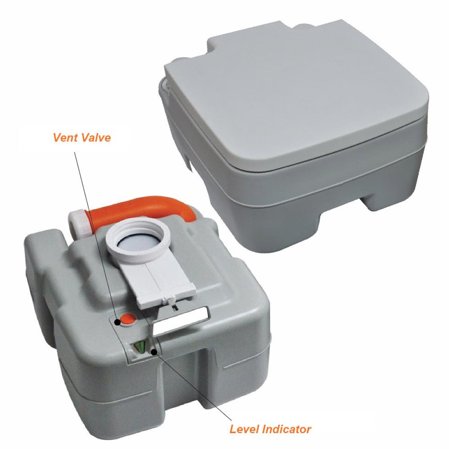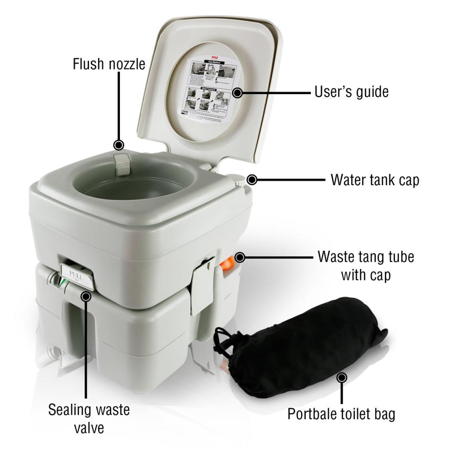 Crafted from high-density polyethylene, this portable camping toilet is both lightweight and durable, easy to add to your trunk or throw over your shoulder with the included travel bag. The water tank holds up to 3.2 gallons, allowing you up to 50 flushes, operated by a tank-top button. 3-way spray nozzle help to empty the bowl and keep it clean after repeated use. Double-sealed valves make sure no odors or liquids escape. The waste tank holds up to 5.3 gallons, more than enough to keep your campers happy for days without needing to empty. When it's time to empty, a no-splash pour spout makes sure the transfer trouble-free.
