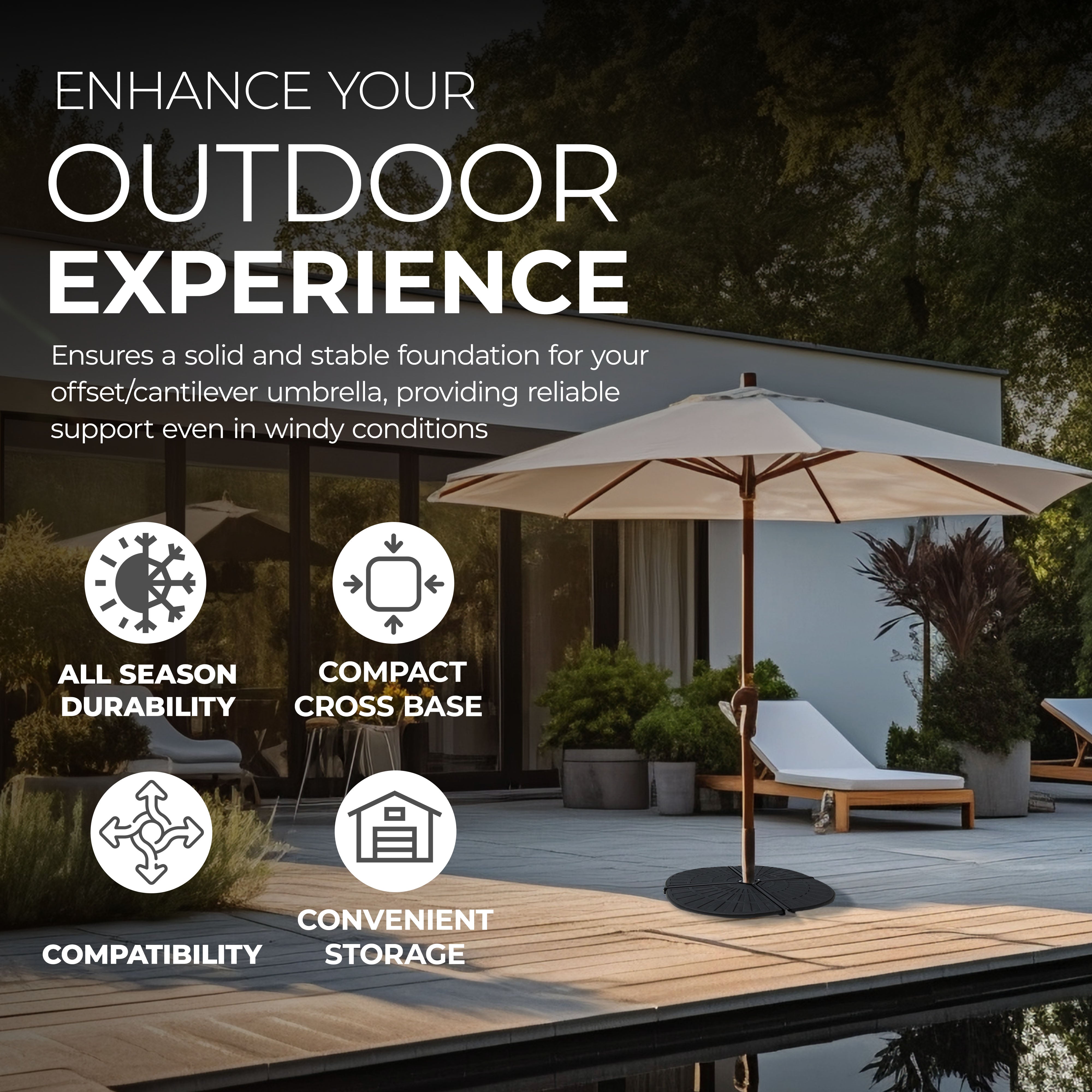 Engineered with precision, the compact cross base offers a reliable foundation to secure your umbrella, keeping it firmly in place even in gusty winds. The black finish adds a touch of sophistication, effortlessly blending with your outdoor décor. Say goodbye to shaky and unreliable umbrella bases. This umbrella accessory is built to withstand the elements and provide long-lasting stability. To ensure optimal stability for your offset umbrella, it's recommended to use a total of 4 sector bases. This strategic placement guarantees a secure and well-balanced foundation for your umbrella, allowing you to enjoy shade and relaxation without any worries.