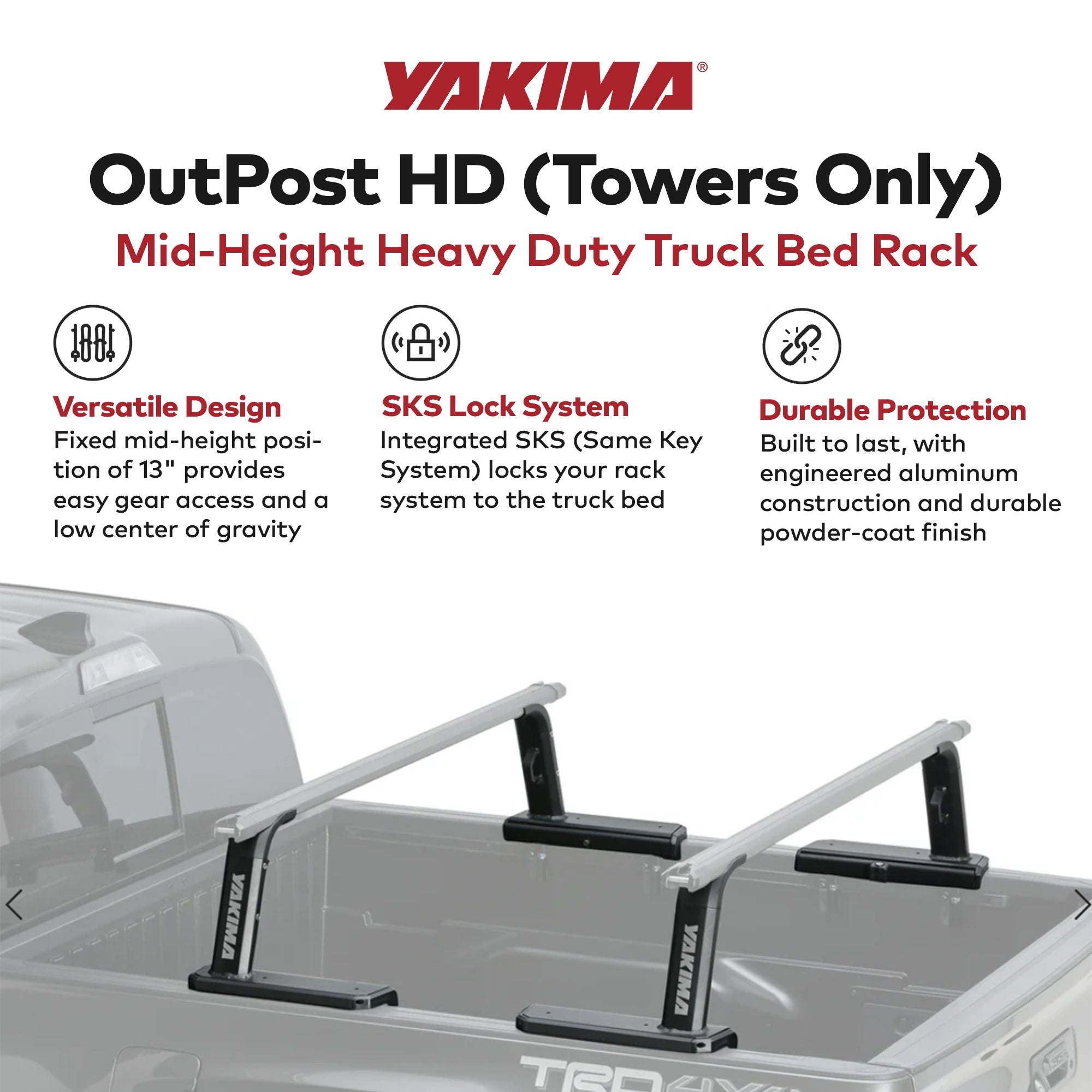 Advance your hauling game and choose the Yakima OutPost HD (Towers Only) Mid-Height Heavy-Duty Truck Bed Rack, and let your journey be as limitless as your imagination.
