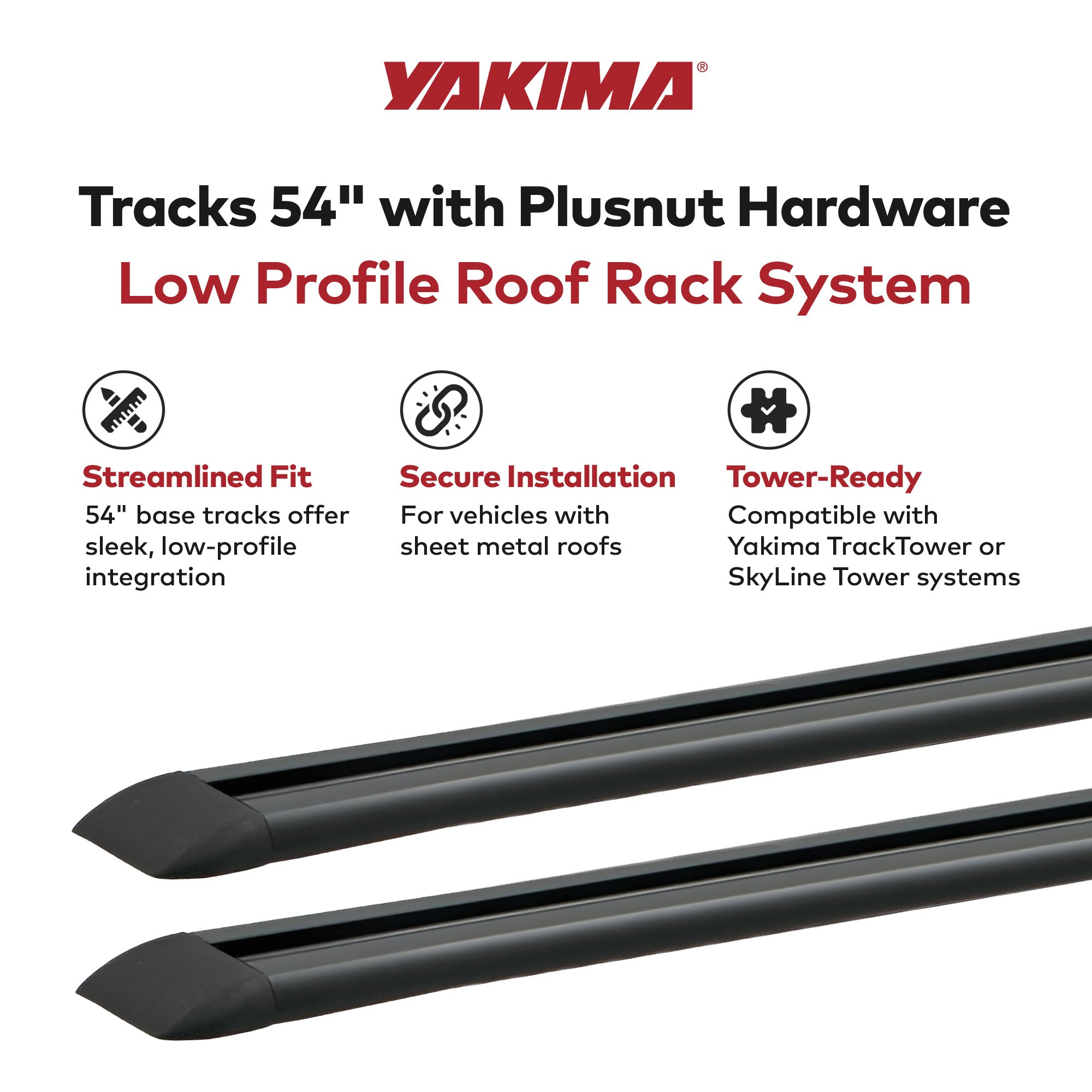 - Base tracks designed for easy connectivity with either Yakima TrackTower or Yakima SkyLine Tower paired with Landing Pad 1 (sold separately) for a seamless and sleek rooftop car rack system integration
