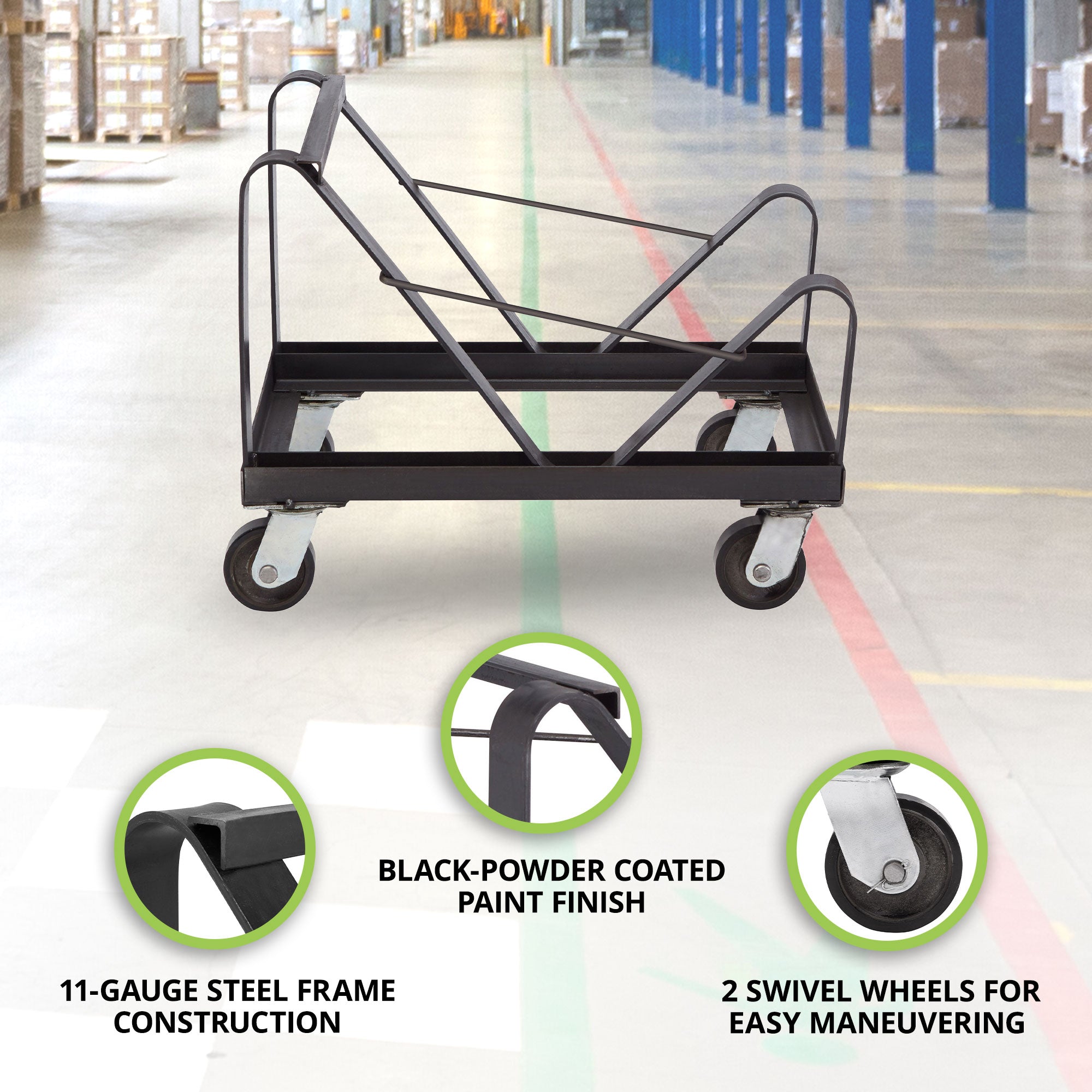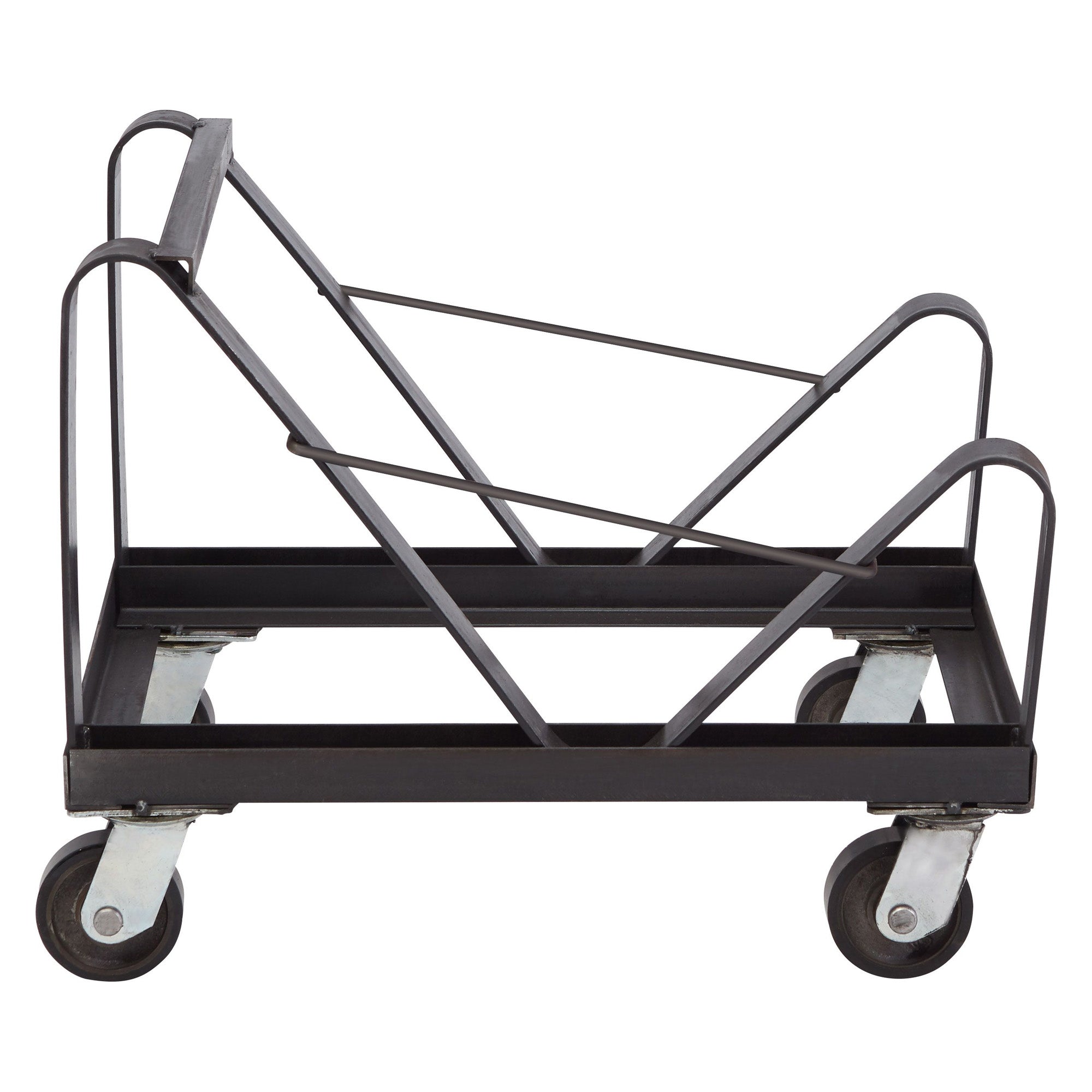 With an 11-gauge steel frame, this chair dolly for stackable chairs is built to store chairs at an angle, ensuring that they are securely stored and allowing the dolly to hold up to 40 chairs at once. This banquet essential sitting on 4 wheels (2 wheels that swivel) allows for easy storage and transport making this a must-have for medium to large events. Featuring a black-powder-coated paint finish, this event accessory does not chip easily and adds to the dolly's durability. The polyurethane casters ensure that this chair trolley is easily maneuverable and can be moved over most surfaces. Each caster is able to hold 165 pounds making this chair mover dolly able to hold a total of 660 pounds. With a compact design and sitting at 20.5 inches wide, 21 inches long, and 26 inches tall, this vertical chair dolly can easily be tucked away when not in use.