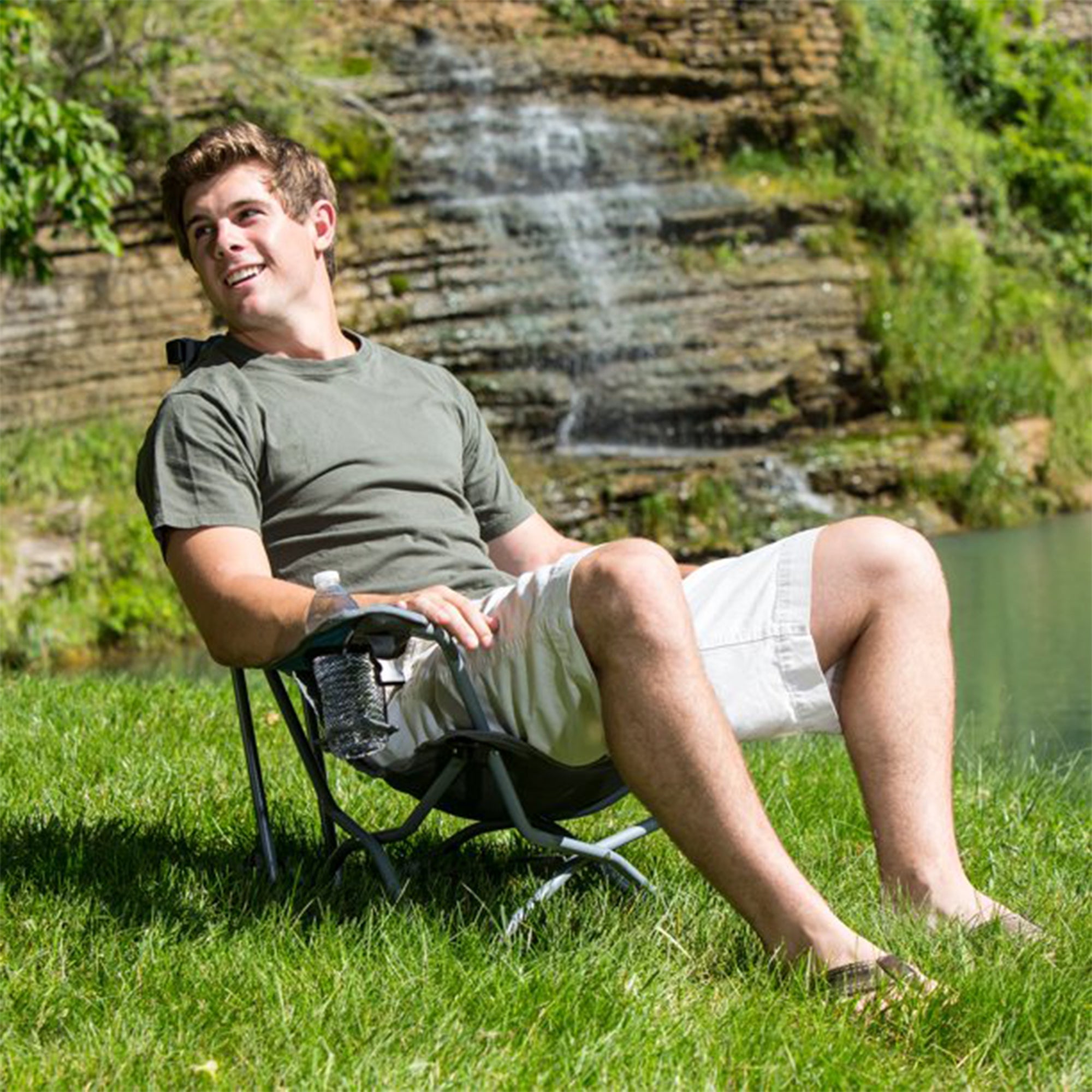 The adjustable headrest and built-in cup holder allow you to relax with your favorite beverage by your side. This lightweight chair weighs 8.25 pounds, yet supports adults up to 250 pounds. Low profile, this camping chair features a back at a slightly angled position for maximum relaxation.