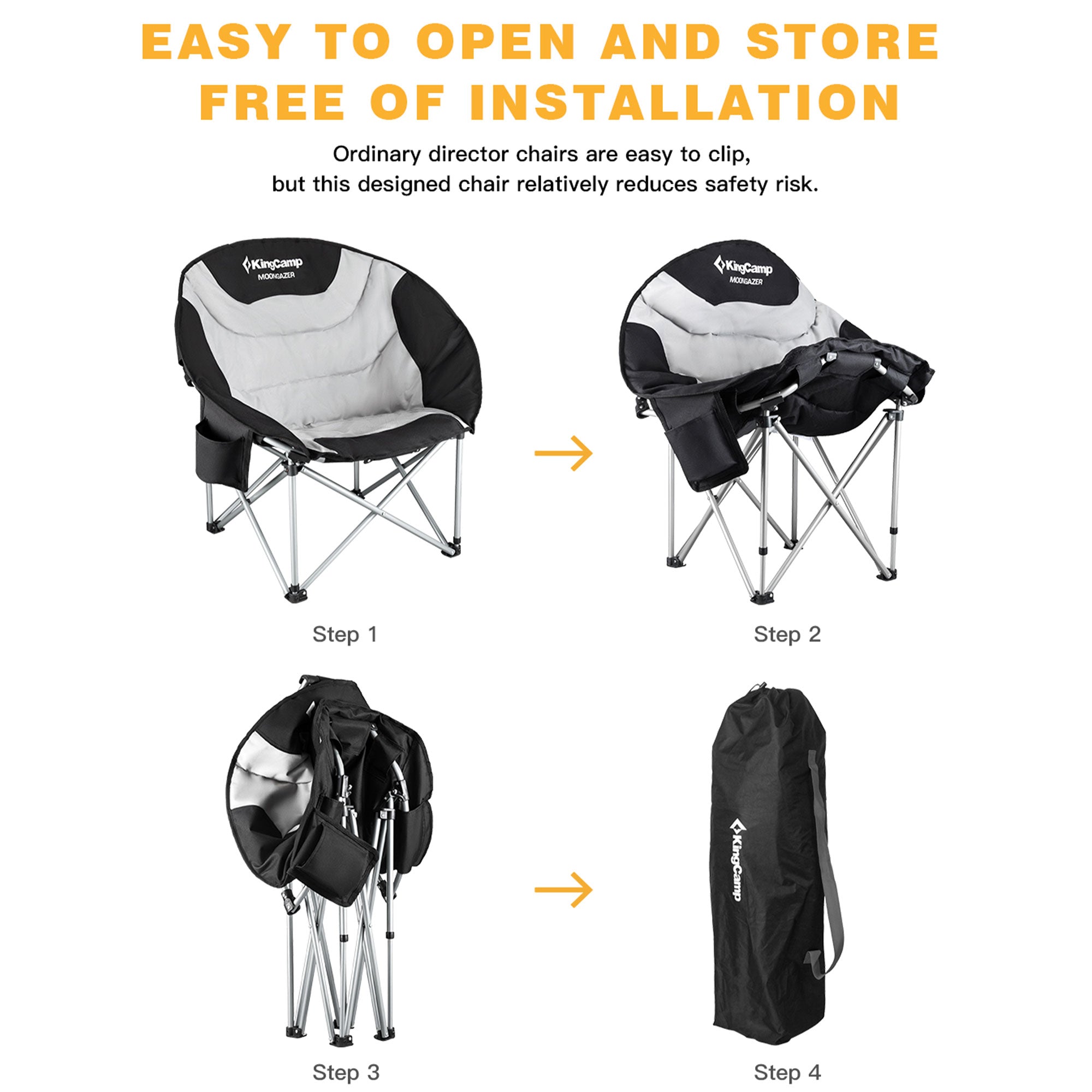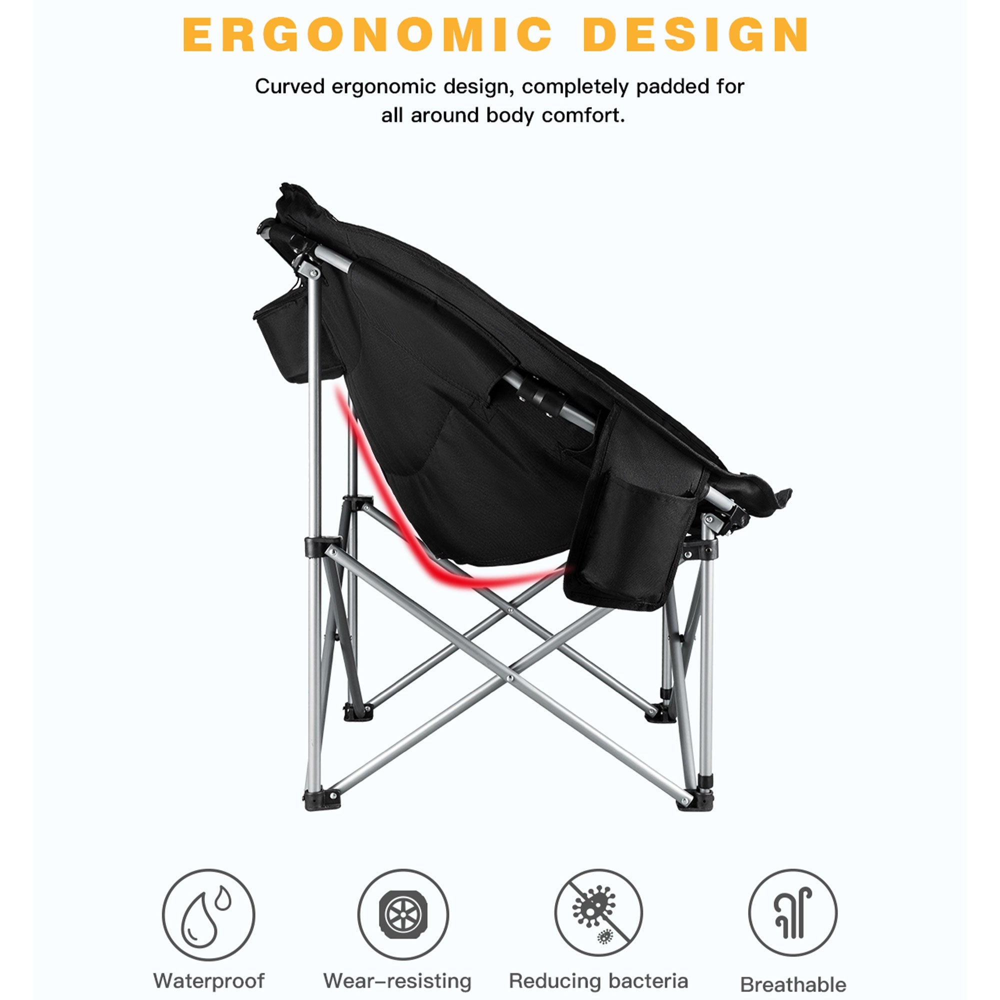 - Foldable saucer camping chair constructed from heavy-duty steel and moisture-wicking 600D Oxford fabric, enhancing overall weight capacity to 300 pounds
