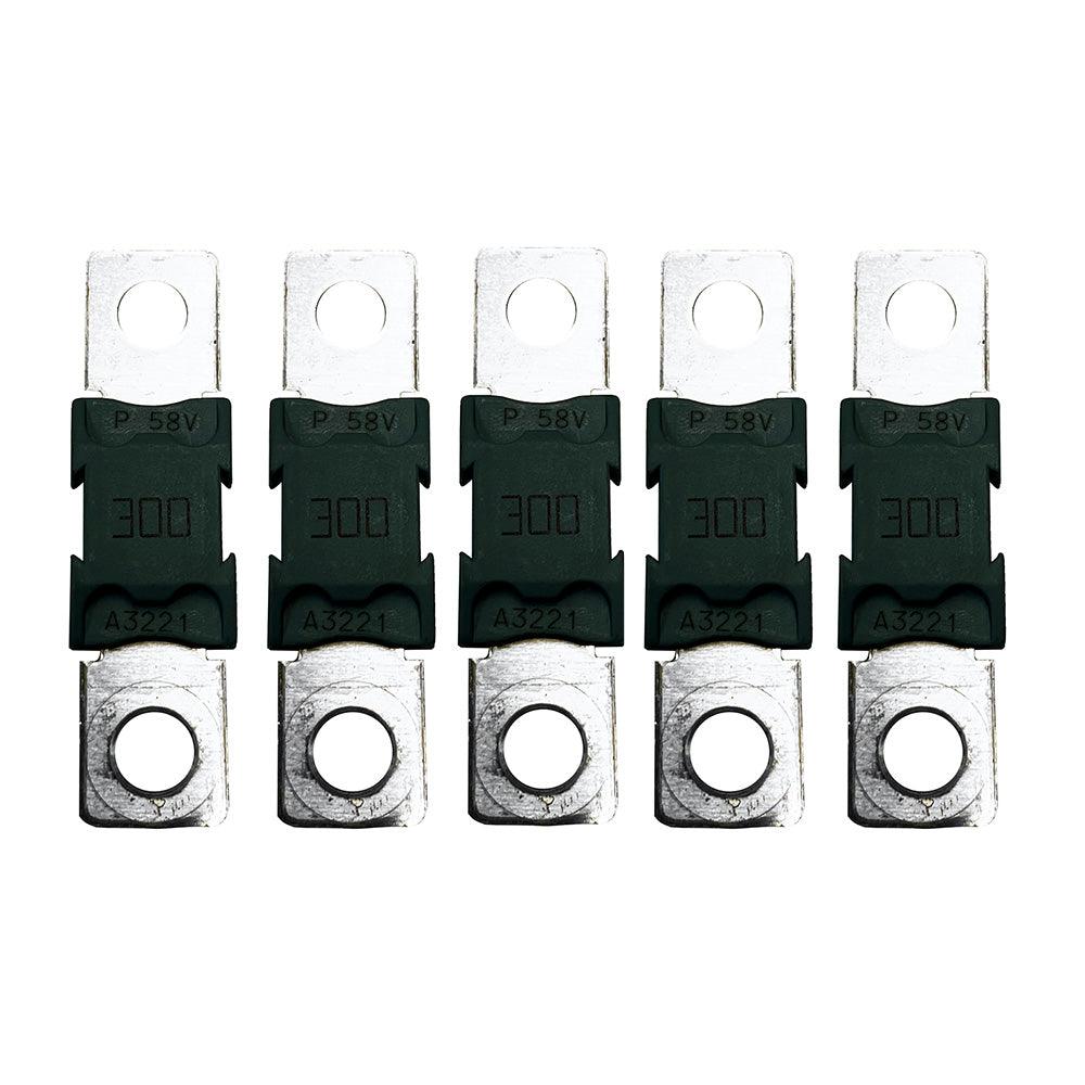 Victron Energy's MEGA fuses are frequently used in Victron Energy DC distribution systems. This particular pack of Victron MEGA fuses contains five 300 amp fuses.