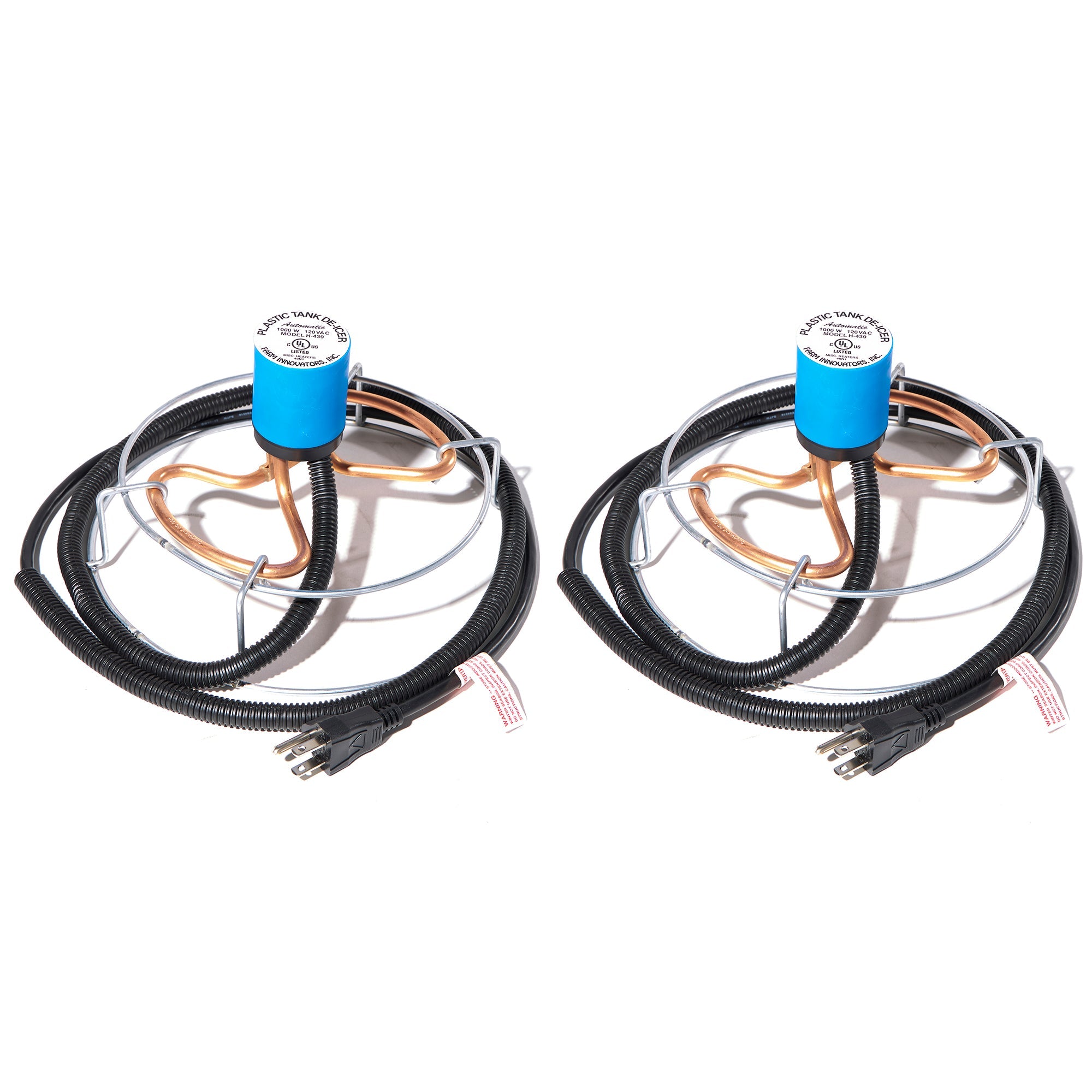- Pack of 2 water deicers designed to rest at the bottom of watering tanks used around the farm and home