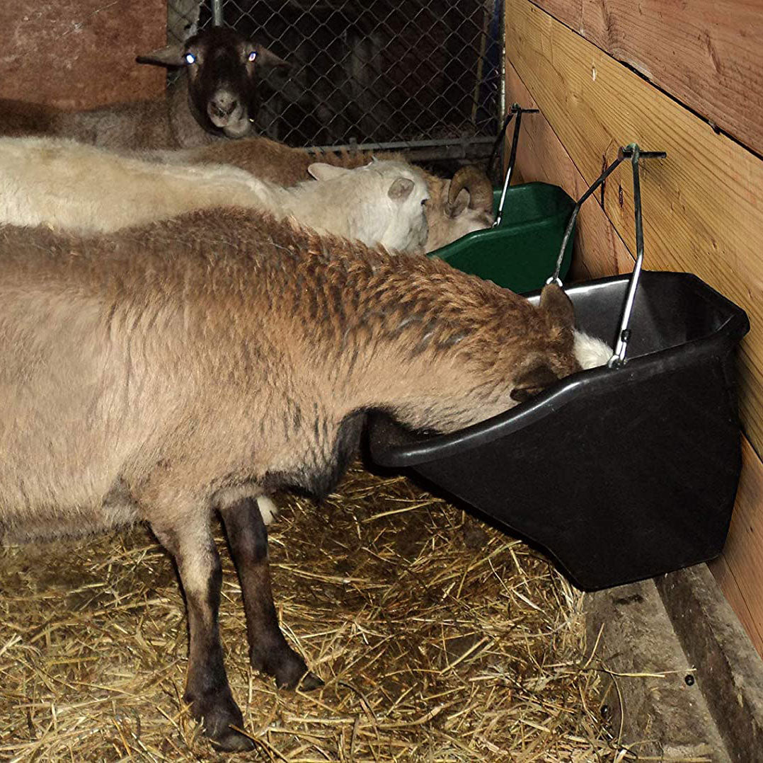 Tapered sides funnel feed toward the back of the bucket, making feed and grain more accessible without the animal having to strain in an awkward position. The flat-back style provides stability against a wall or fence. This feed bucket mounts on a flat wall with either a traditional wall bracket or snap hook (not included). It features a durable, impact-resistant, high-density polyethylene construction with smooth, finished edges. The heavy-duty metal handle is notched for hanging. This feed bucket measures 20 inches long by 16 inches wide by 14 inches high and holds 20 quarts (5 gallons).