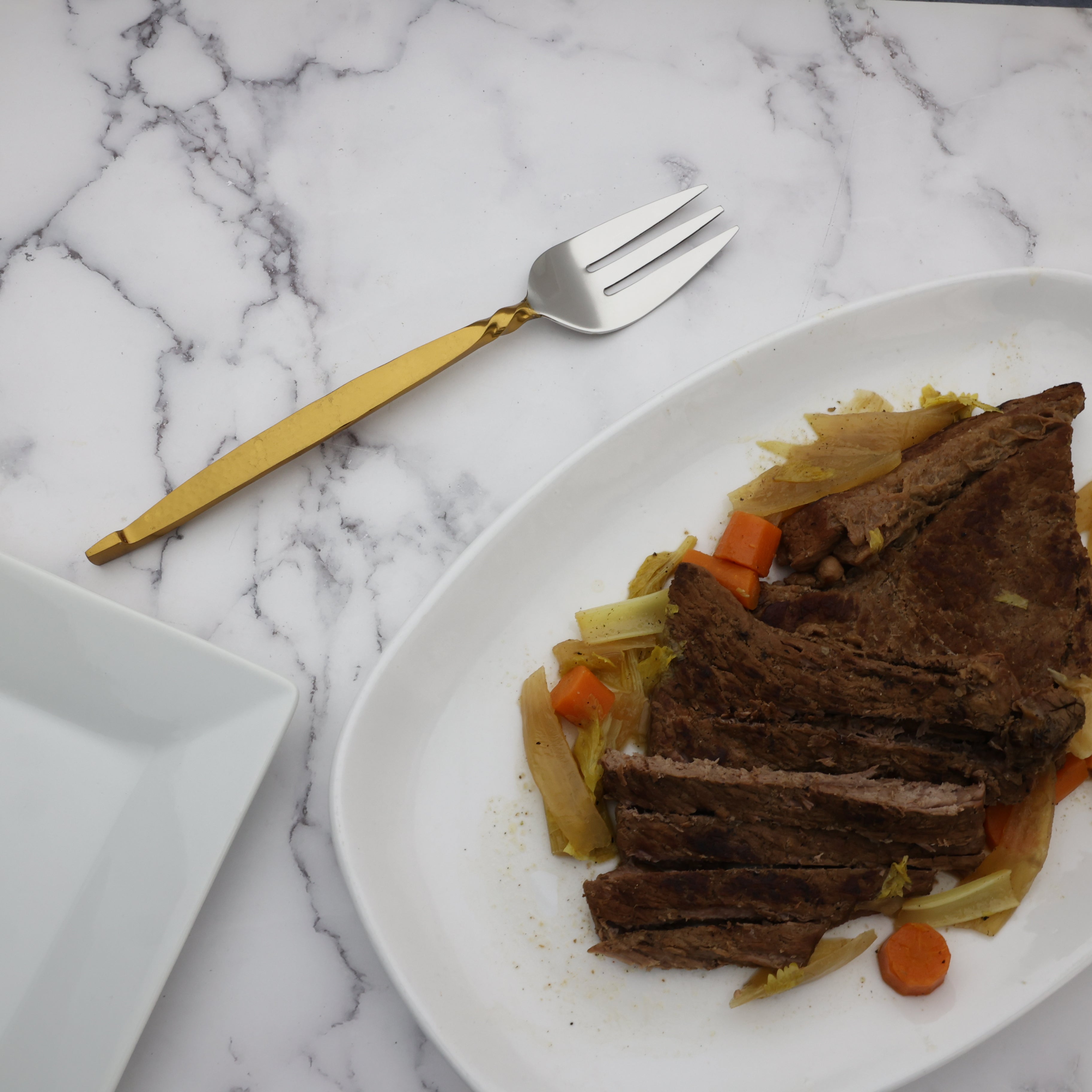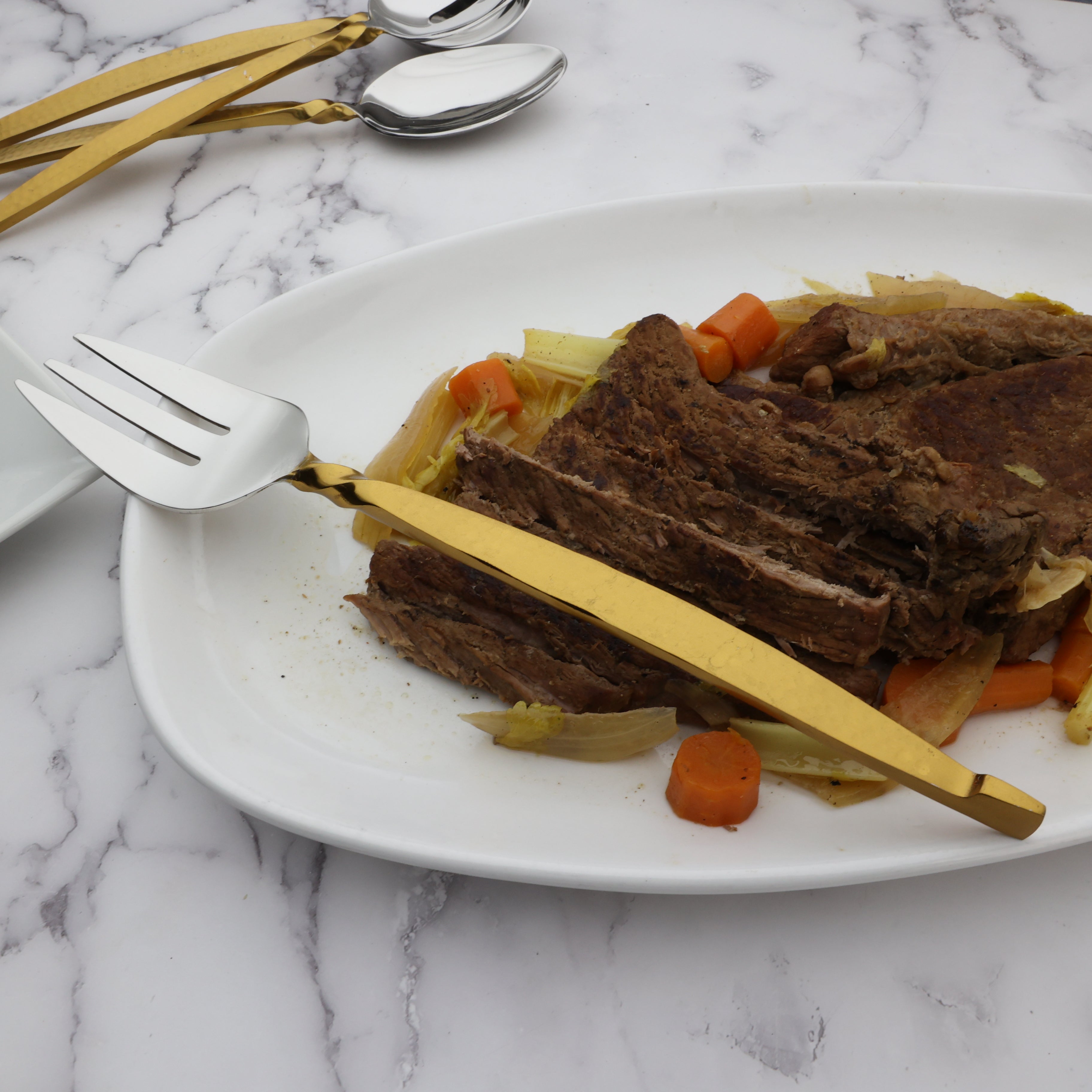 • Sets include: 1 three-pronged fork, 1 slotted spoon, 1 serving spoon, and 1 sauce ladle