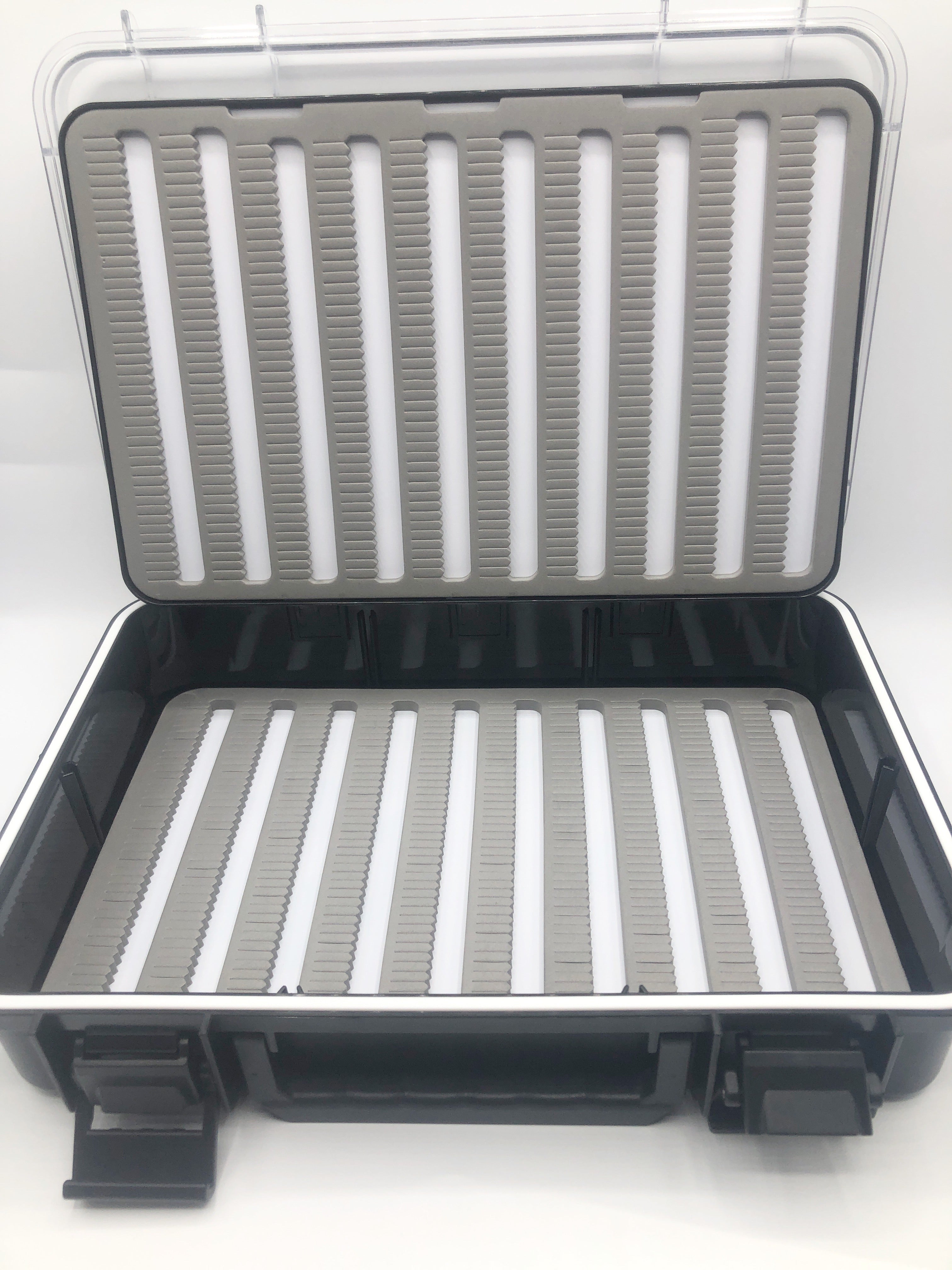 These boxes are becoming more popular in the industry. They are perfect for the large flies of musky and pike anglers, saltwater anglers, as well as a great boat box for those who use drift boats and want to hold a large amount of flies in one box. Waterproof. Slit foam on both styles