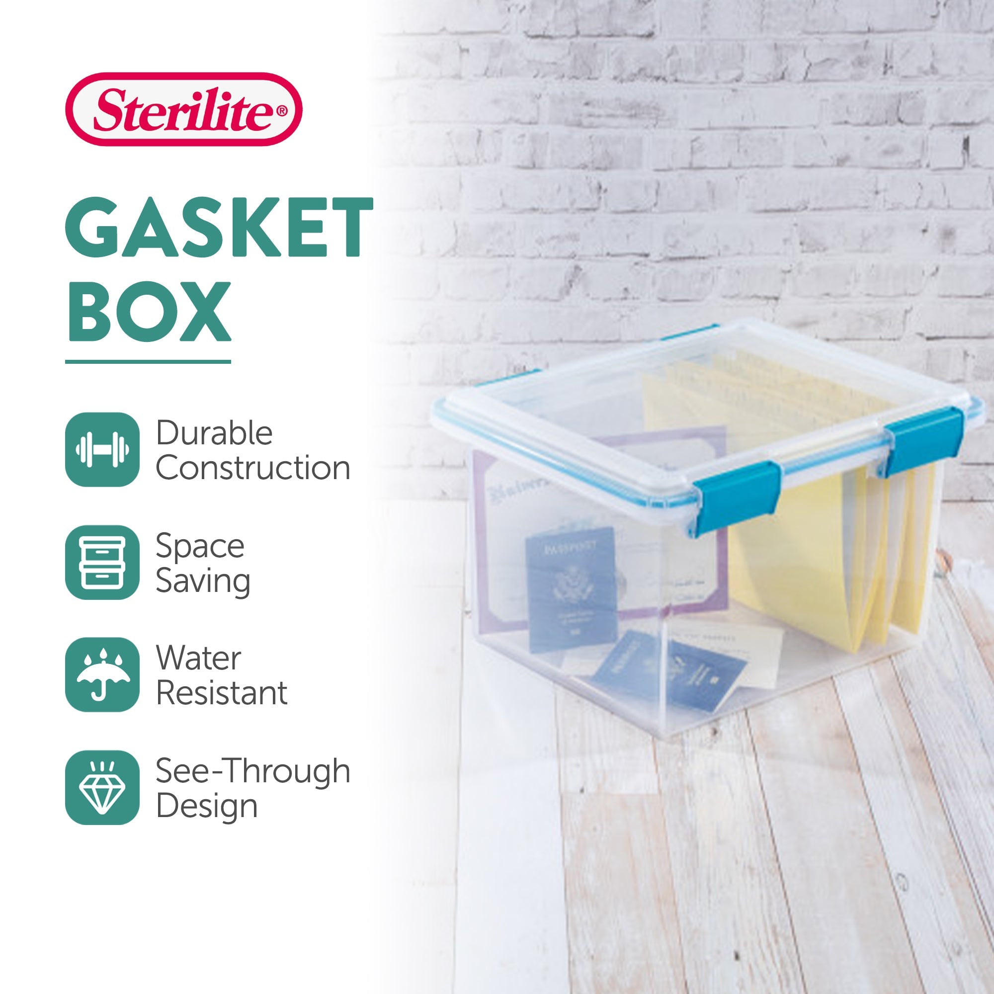 The 16-pack of Sterilite 32-Quart Gasket Boxes includes 16 clear, plastic storage containers that are great for organizing paperwork, school projects, photographs, or even clothing in your home or office. Keep a clutter-free home with these durable, and versatile storage bins.