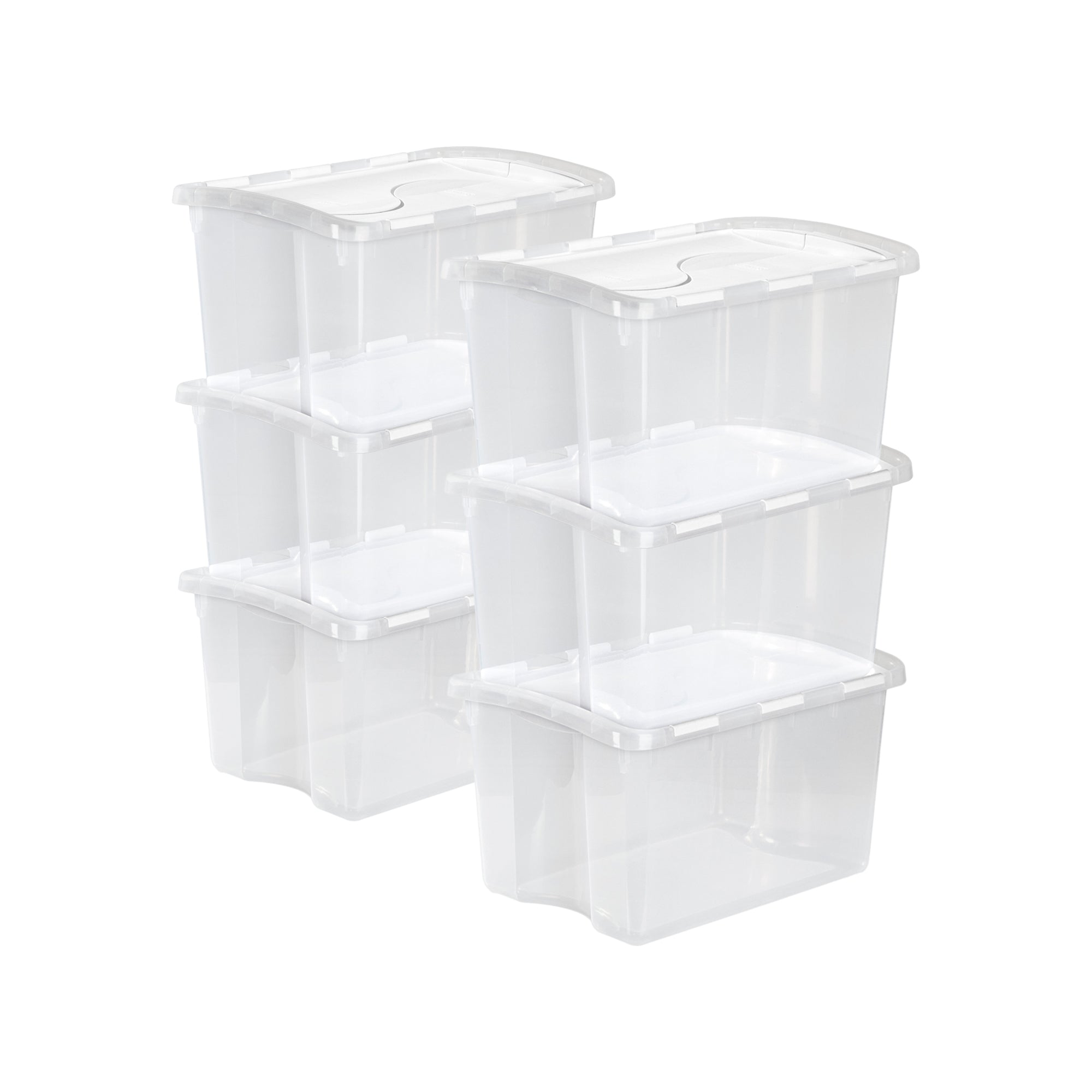 These multipurpose plastic storage containers are great for organizing household decor items, seasonal clothing, gardening supplies, bulk food, and additional blankets. With a see-through base, you're able to view the contents inside for a quick and easy grab. Each storage box is equipped with a latching hinged lid to ensure your valuables remain safely inside without dirt or debris seeping through, while the built-in handles make transporting room to room a breeze. The indexed lids allow you to stack each bin on top of the other to maximize storage space in your garage, basement, or shed.