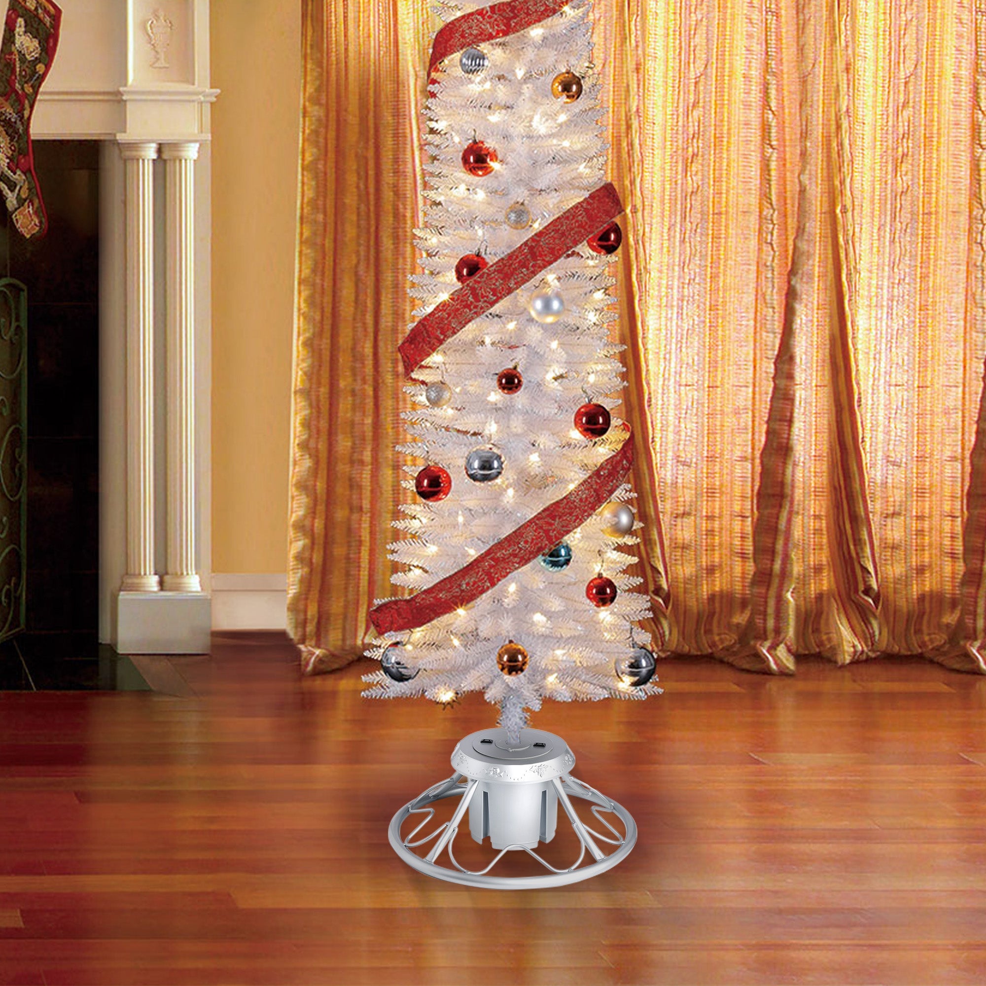 Your beautifully decorated Christmas tree deserves to be shown off. Featuring an innovative design, this stand allows for full 360-degree rotation for added holiday cheer so every side of your tree is seen. Simply plug the tree cord into the base and plug the base cord into the outlet for easy use. This tree stand is crafted from durable metal for lasting strength and provides convenient storage in your home or garage when the holidays are over.