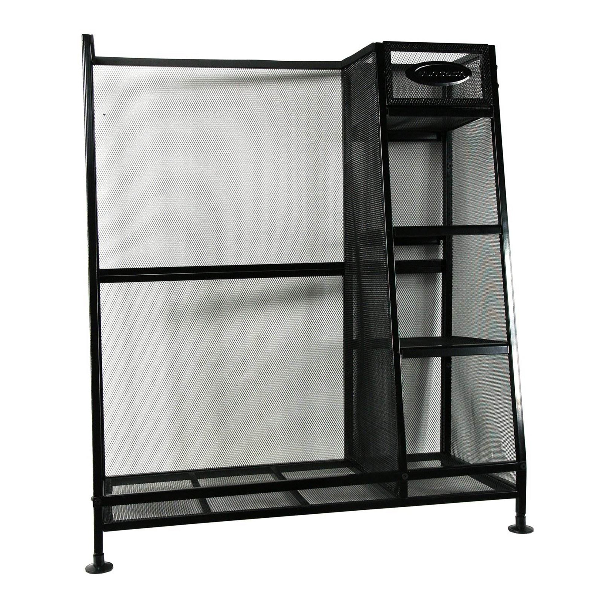 It's constructed of heavy duty metal with leveling feet to adjust on uneven surfaces and can hold up to 105 pounds of golf goodies. There's room for 2 golf bags, a bin for loose balls, tees, and small things, and shelving for rain gear, shoes, and towels.
