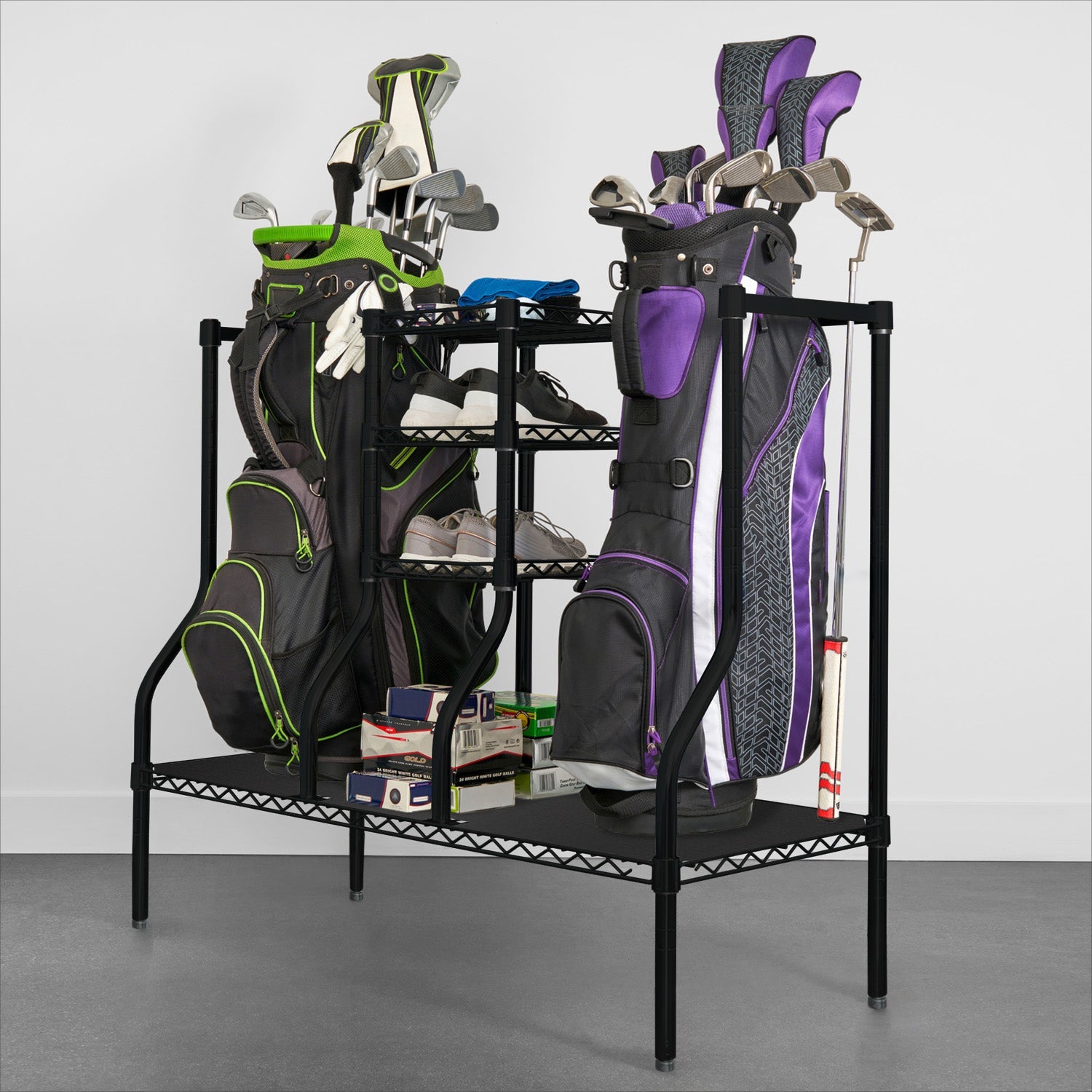 Elevate your golf game organization with the SafeRacks Golf Equipment Organizer Rack. Designed to seamlessly accommodate all of your golf clubs and essentials, this spacious unit measures 18" deep, 43" wide, and 40" tall, providing ample room to store two tour-sized cart bags in its extra-wide large bag ports, along with various sizes of golf bags and additional room to spare.