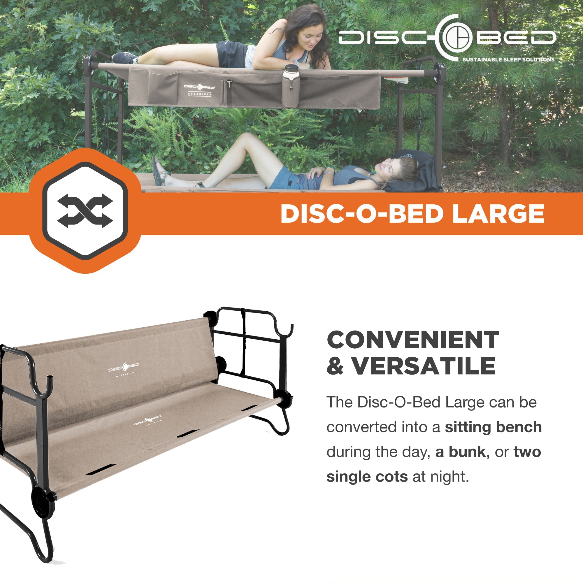 Disc-O-Bed Large Cam-O-Bunk Benchable Double Cot with Storage Organizers, Tan