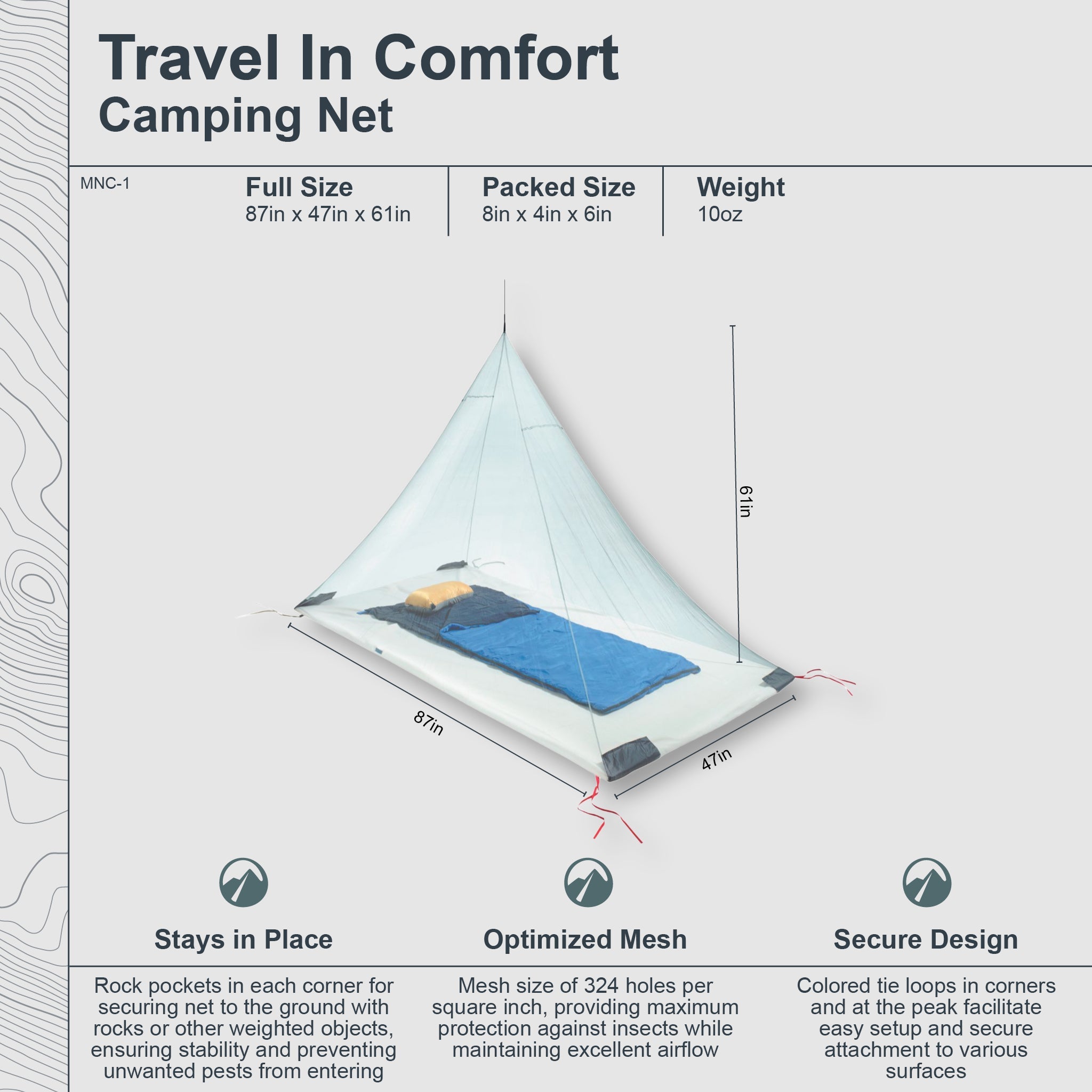 Crafted from lightweight yet durable materials, this net offers reliable protection against insects, ensuring you can sleep soundly through the night. Whether you're nestled in the woods or by the tranquil waters of a lake, our camping net guarantees a comfortable and bug-free experience, allowing you to wake up refreshed and ready for the day's adventures.