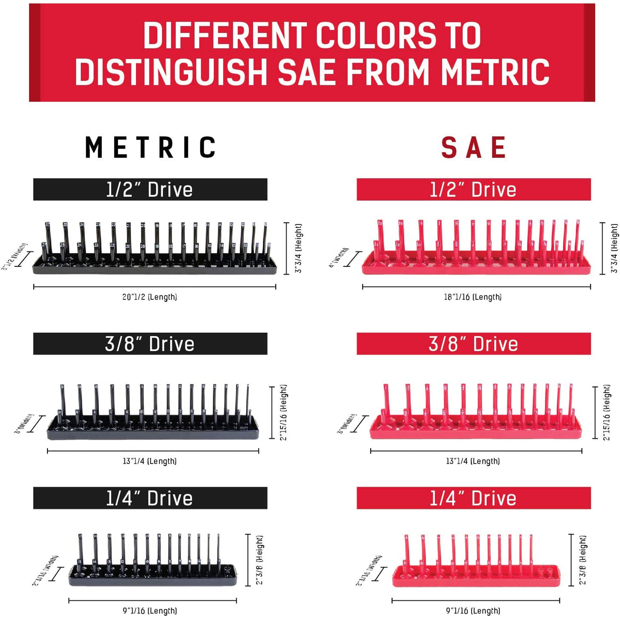When you're working on projects, time is precious. Save time looking for tool parts with handy trays that provide both SAE and metric sizing. 3 red trays provide storage for SAE measurements and 3 black trays offer a place for metric sizing with size labeling for easy recognition. Suitable for both deep and shallow sockets, the tool box trays include a specific fit per rung so everything stays orderly, and is easy to return back to the correct place. To aid in stability, the tool sorter is developed with an extra-wide base to avoid unnecessary tipping. For optimal storage, the 1/4-inch trays can fit sizes 1/8-inch to 5/8-inch and 4 to15 millimeter, the 3/8-inch tray fits sizes 1/4-inch to 1-inch and 6 to 20 millimeter, and the 1/2-inch trays fit sizes 3/8-inch to 1 1/4-inch and 10 to 27 millimeter.