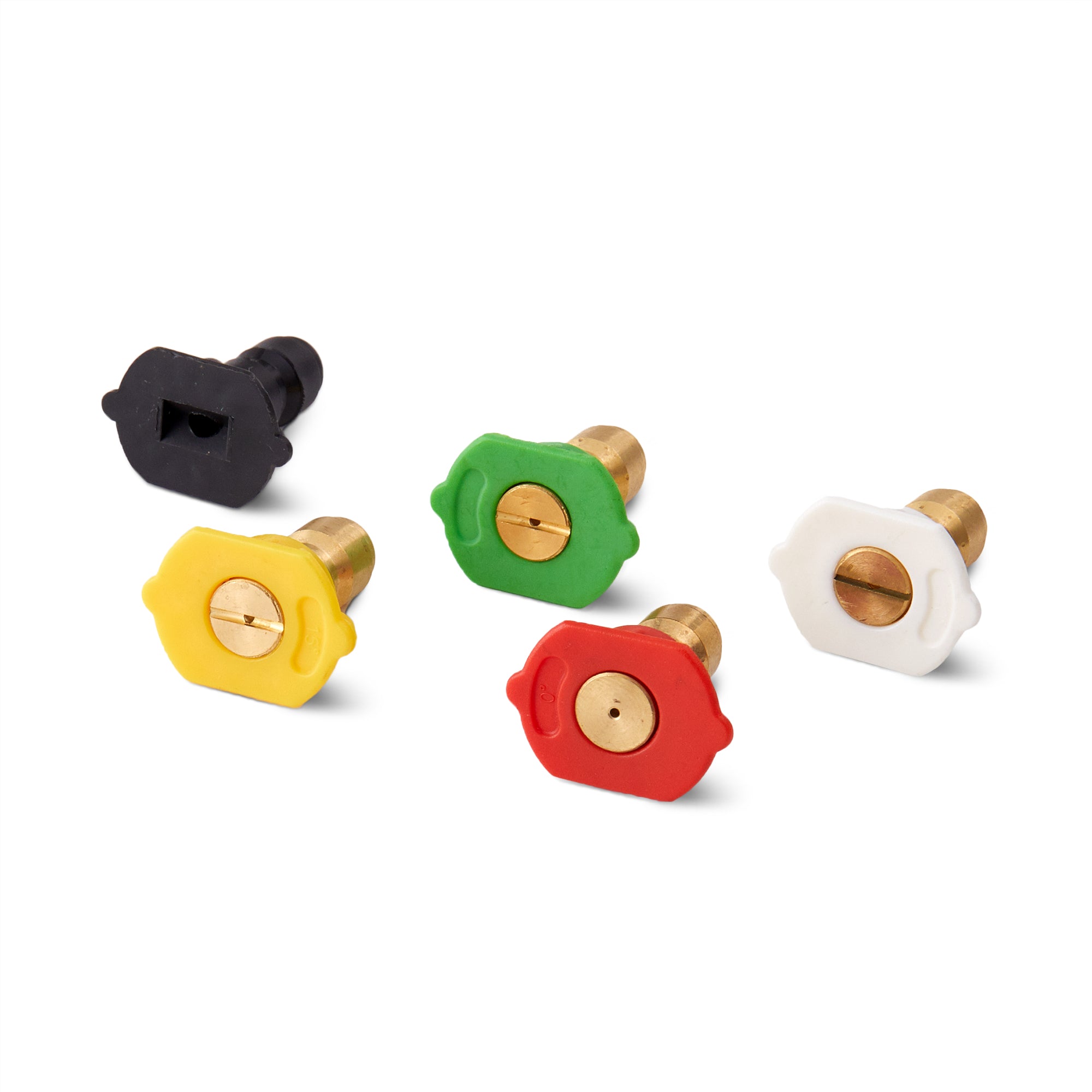 These nozzle spray tips are meant to replace your old, worn out, or lost pressure-washer spray tips. There are 5 different nozzles in the set, ranging from pin point pressure to a wide fan. The nozzles' angles include 0, 15, 25, and 40 degrees. In addition, a cleaning-solution spray tip works for distributing soap or other cleaners for a precise washing of just about any surface.