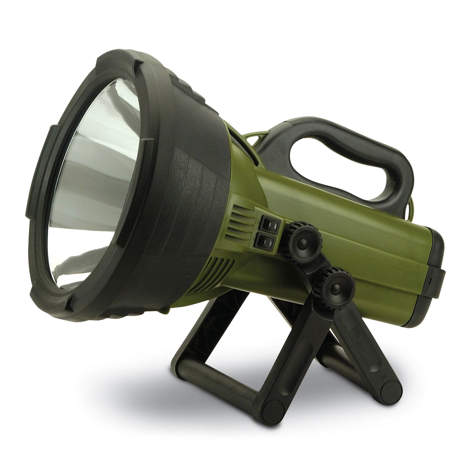 This spotlight features an 18 million candle power light output, perfect for providing ample illumination when on a camping trip, out on a boat, or enjoying an evening on your deck. The flashlight uses a Philips 130/100 watt H4 Halogen bulb with 2 levels of power adjustment, so you'll always have the amount of lighting you need. You can recharge the lamp with either the AC/DC adapter or 12-volt DC car plug adapter, both of which are included with 2 6-volt sealed lead-acid batteries. The adjustable swivel stands so you can point the light exactly where you need it. The durable rubberized construction stands up to heavy use in any outdoor environment.