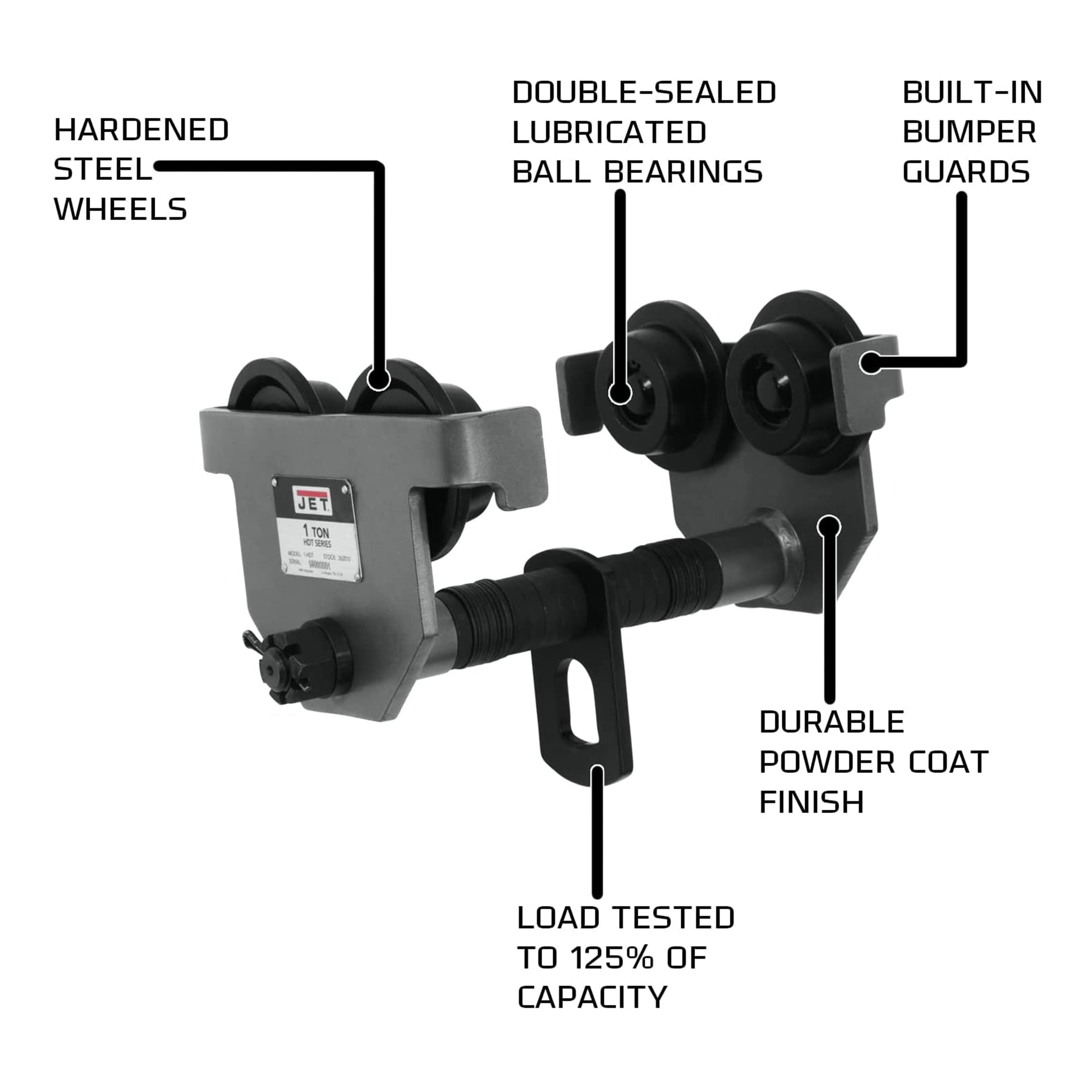 JET 1-HDT 1 Ton Steel Frame Manual Trolley with Bumper Guards and Spacer Washers