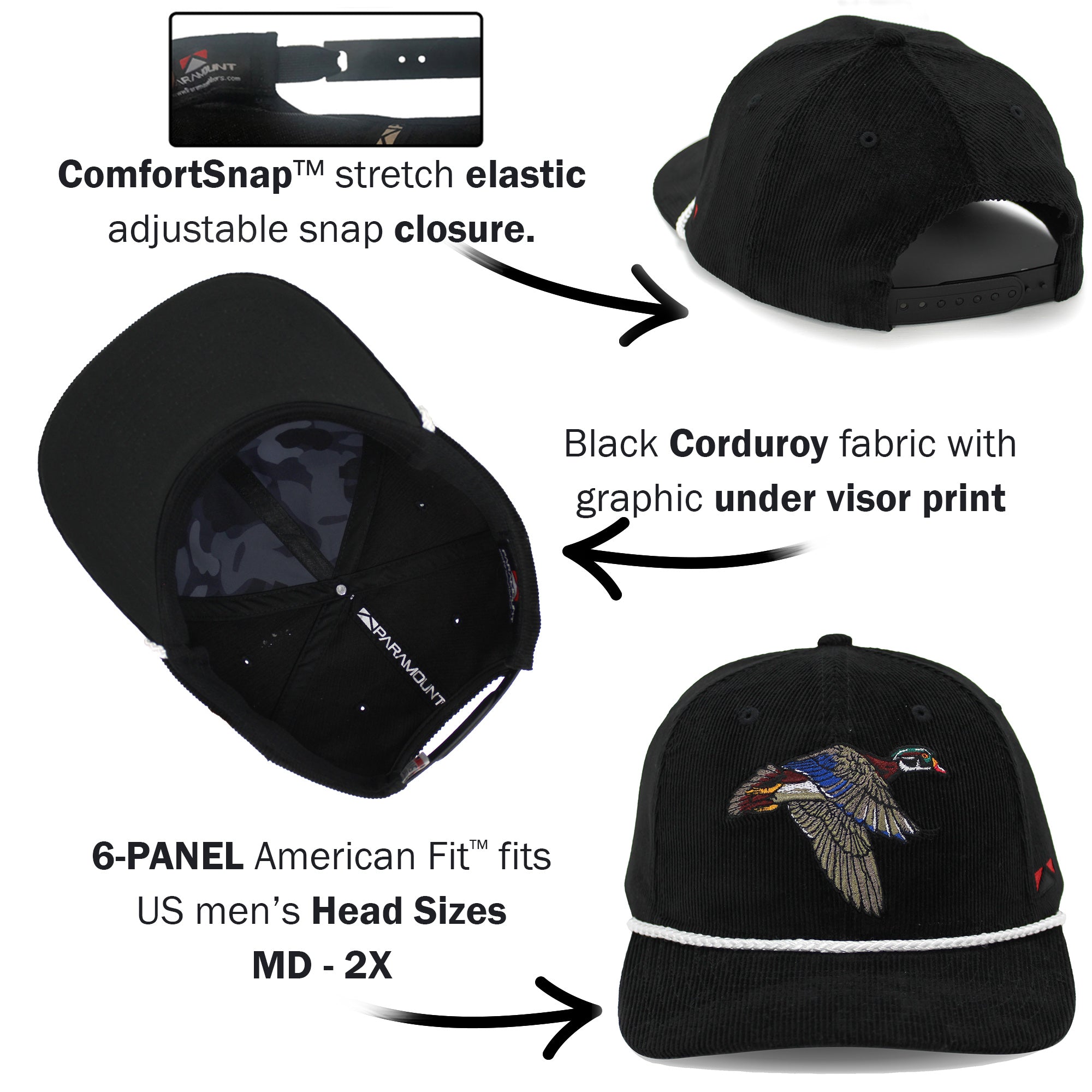 The corduroy wood duck hat is built on our Riverside 6-Panel rope cap style. This unique wood duck hat design features a vintage throwback style on corduroy fabric. Our throwback camo is printed on the under crown and visor for a finished look. Our COMFORT SNAP™ snapback closure combines the stretch of elastic with the adjustability of a snapback, allowing for a custom stretch fit. Lastly, this wood duck hat features our American™ Fit sizing that fits men’s US head sizes MD – XX.