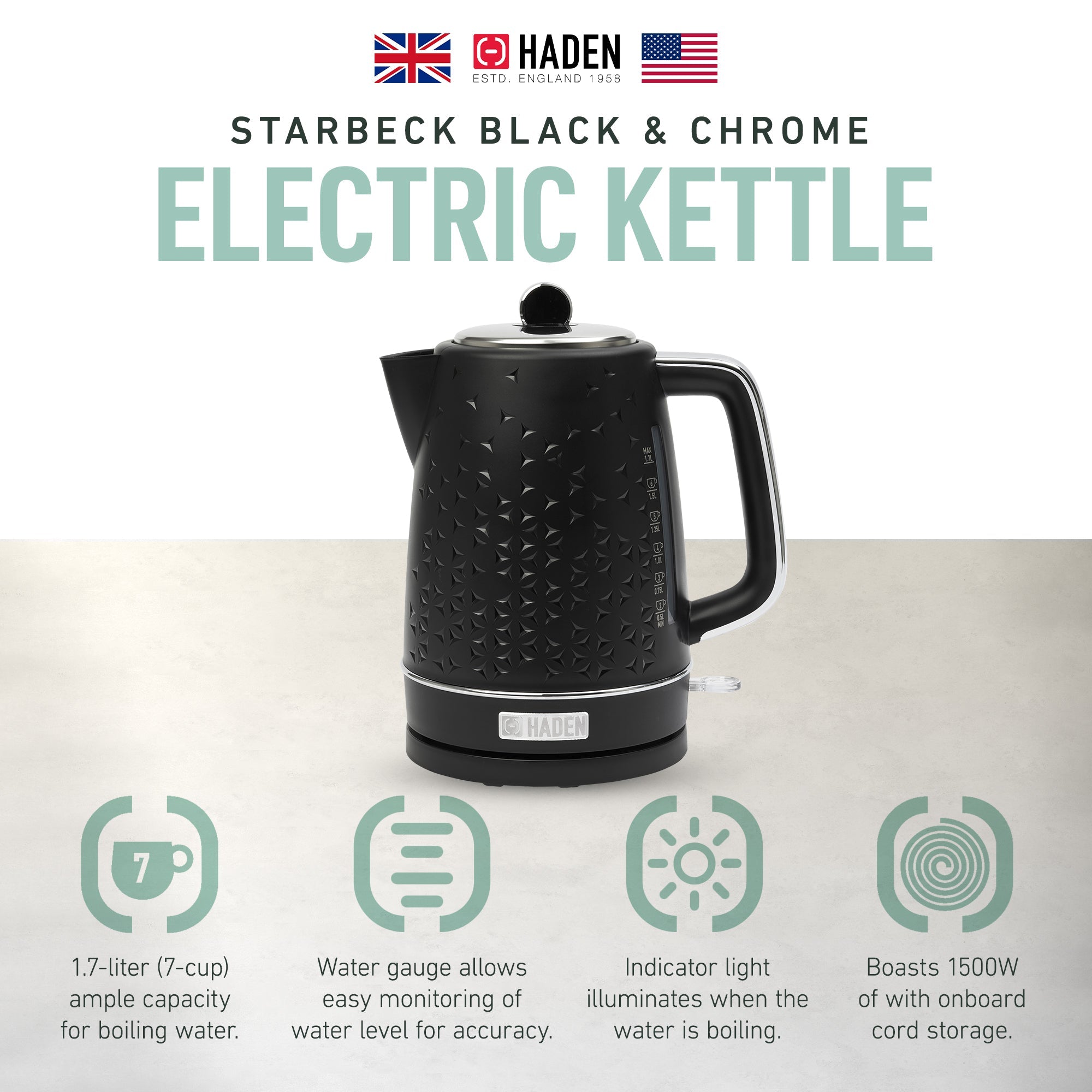 Haden Starbeck 1.7 Liter Stainless Steel Electric Water Kettle, Black & Chrome