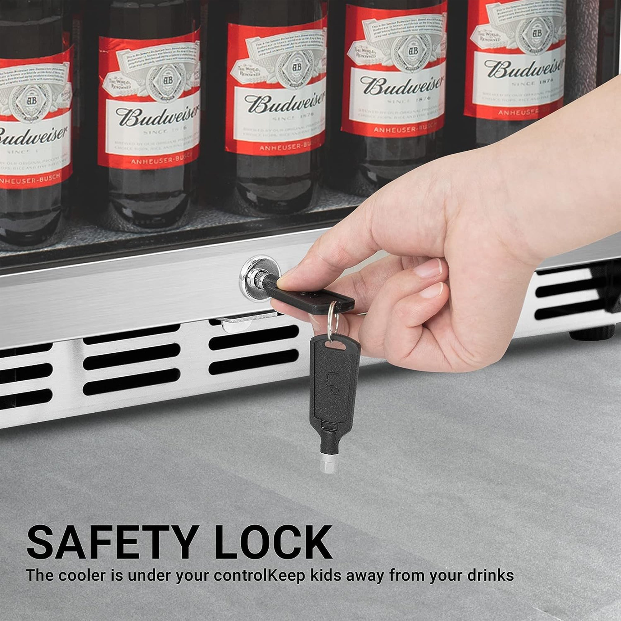 The stainless steel appearance resists high temperatures and offers dust protection to keep your drinks safe inside the wine fridge. Experience added convenience with the automatic closing function, ensuring the door stays shut when not in use. Plus, this beverage refrigerator features temperature alarms for both high and low extremes, keeping your drinks at the ideal temperature. The door alarm alerts you if it remains open for too long. Safety is paramount as this cooler includes a safety lock to keep your drinks secure.