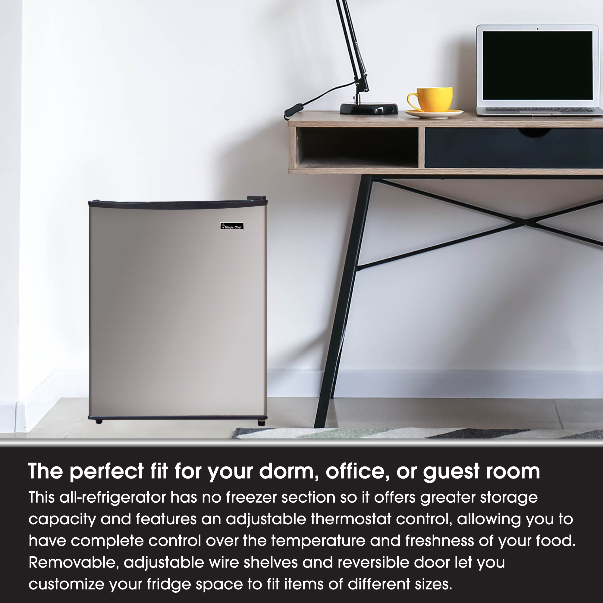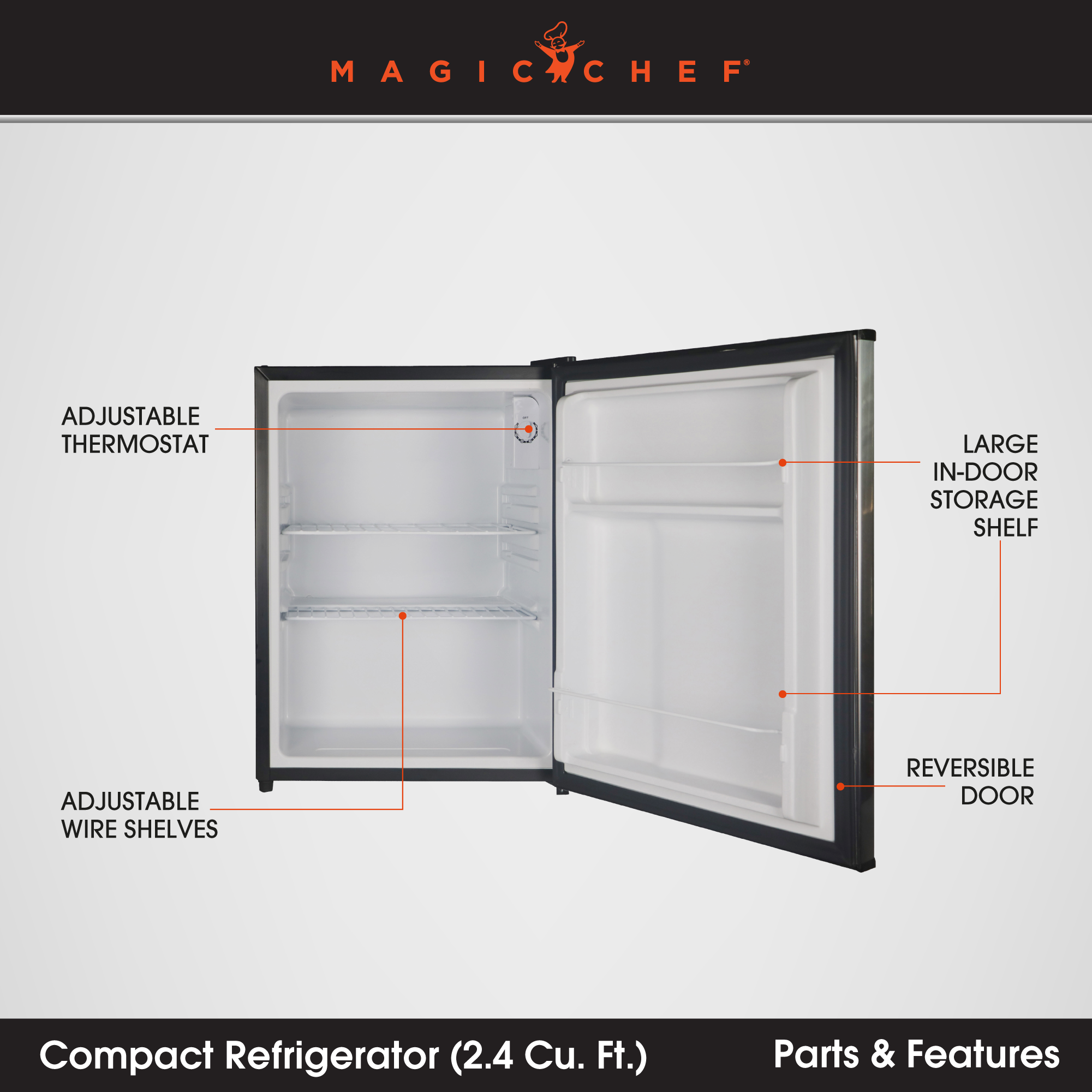 Keep fresh produce, leftovers, and your favorite weekend drinks at a food-safe temperature with Magic Chef 2.4 Cubic Foot Mini Dorm Fridge Freezer. This mini-fridge features a reversible door and flush back design that's easy to add to any setting.