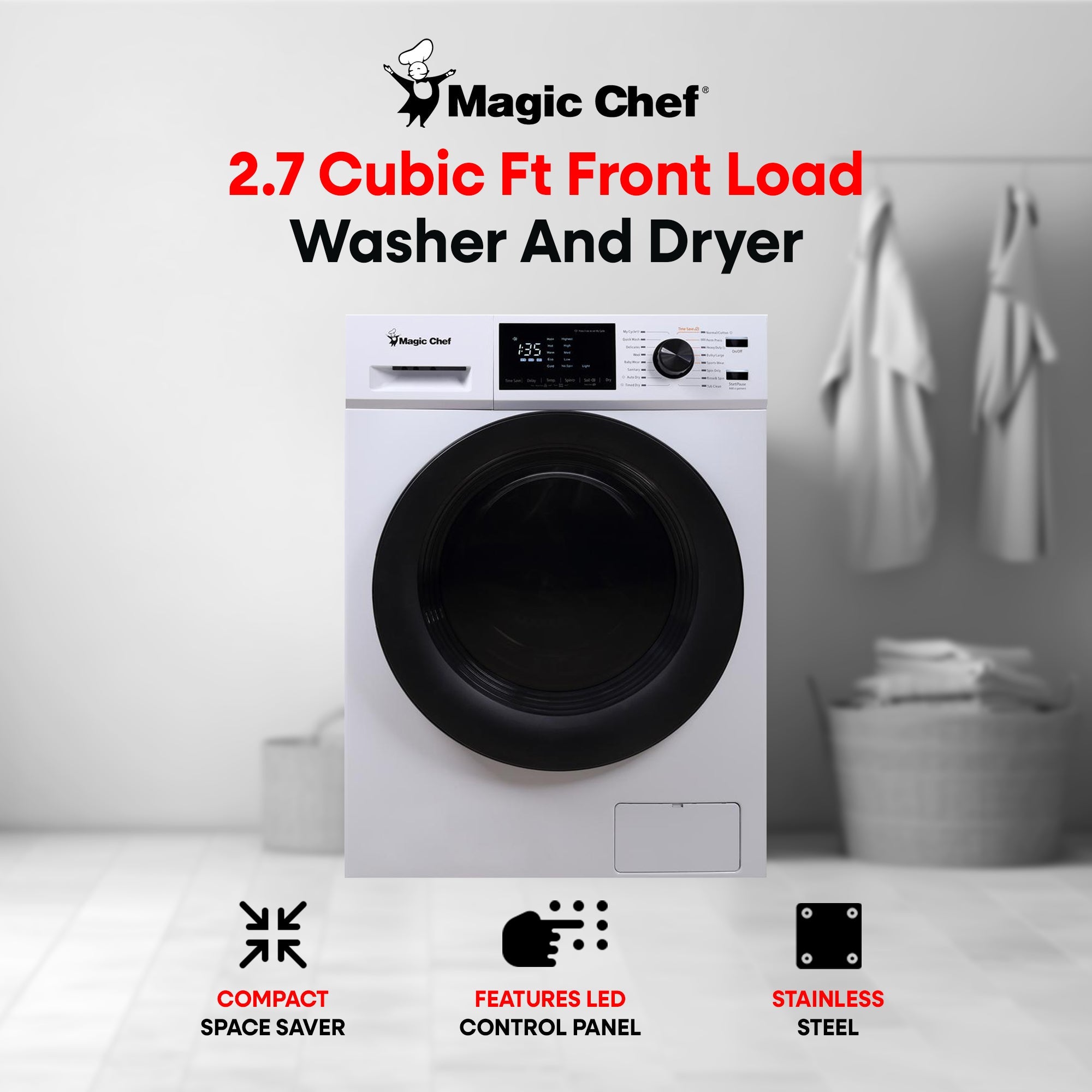 Since the laundry room is where all the good dirt goes, this Magic Chef 2.7 Cubic Foot Front Load Washer And Dryer Combination is the machine that washes and dries it all clean.