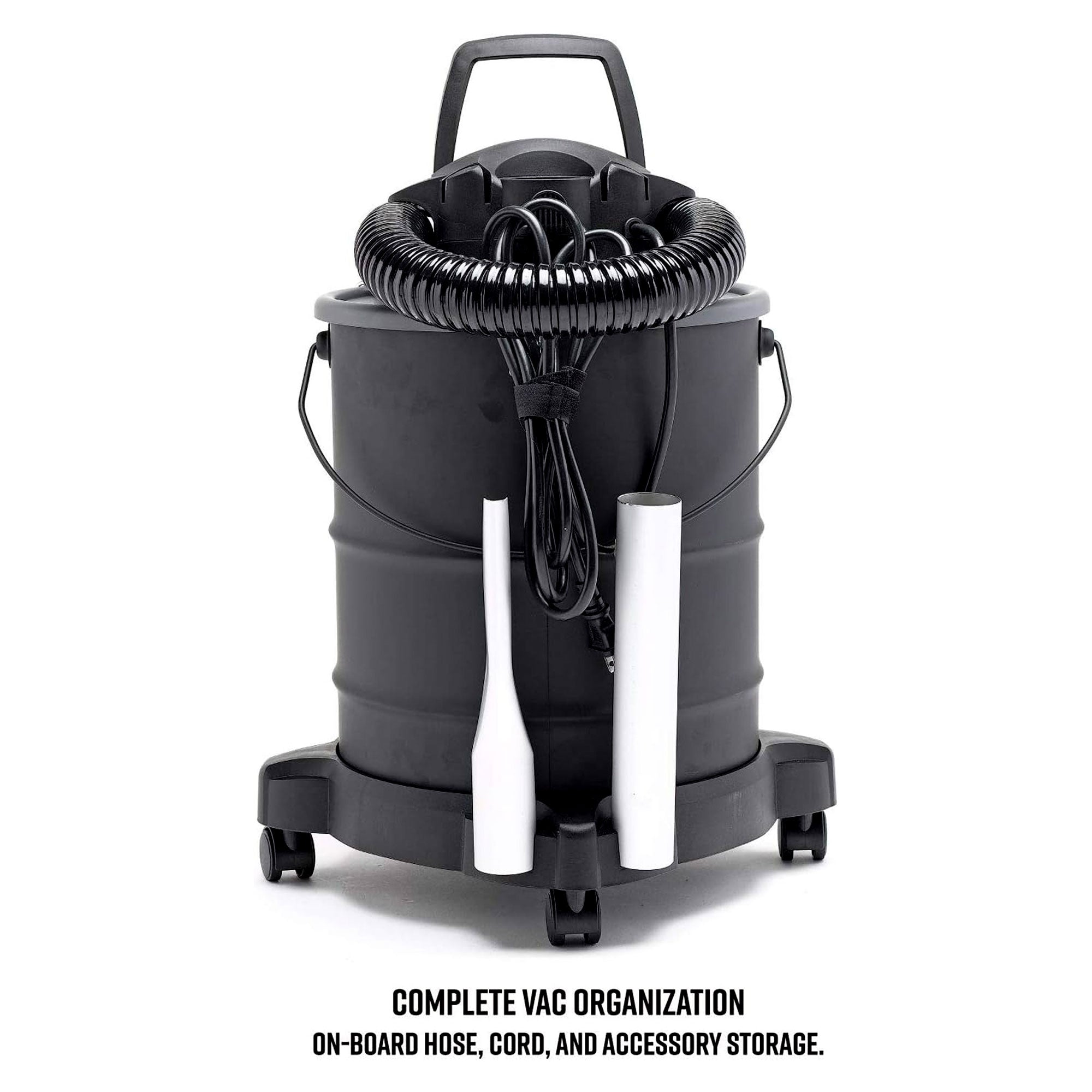 - Stay clutter-free with on-board storage for the hose and accessories, coupled with a folding carrying handle and durable casters for easy transport