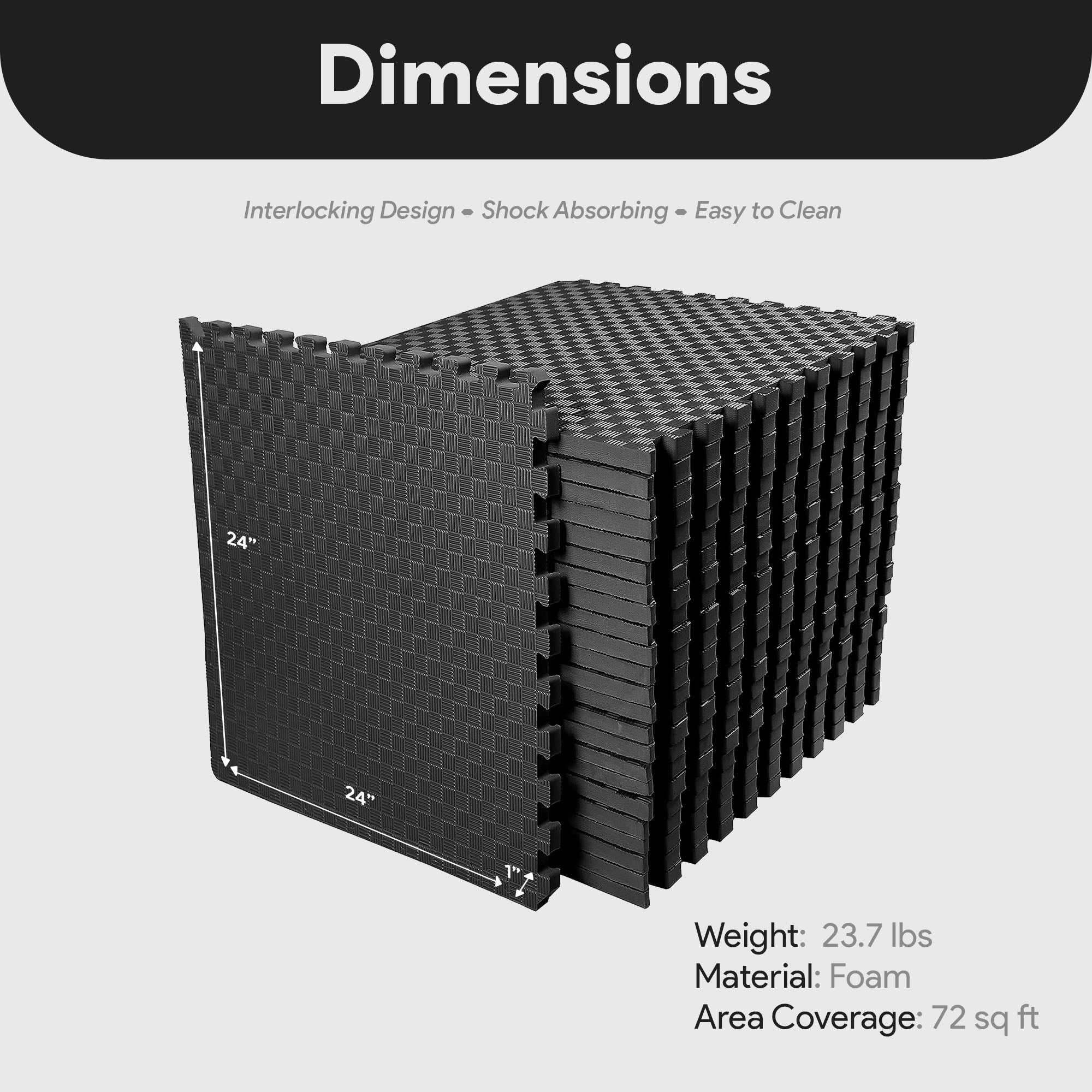 - Set of (18) 24 x 24-inch foam exercise tiles with interlocking edges and 36 end borders for 72 square feet of durable support in your home, gym, or daycare