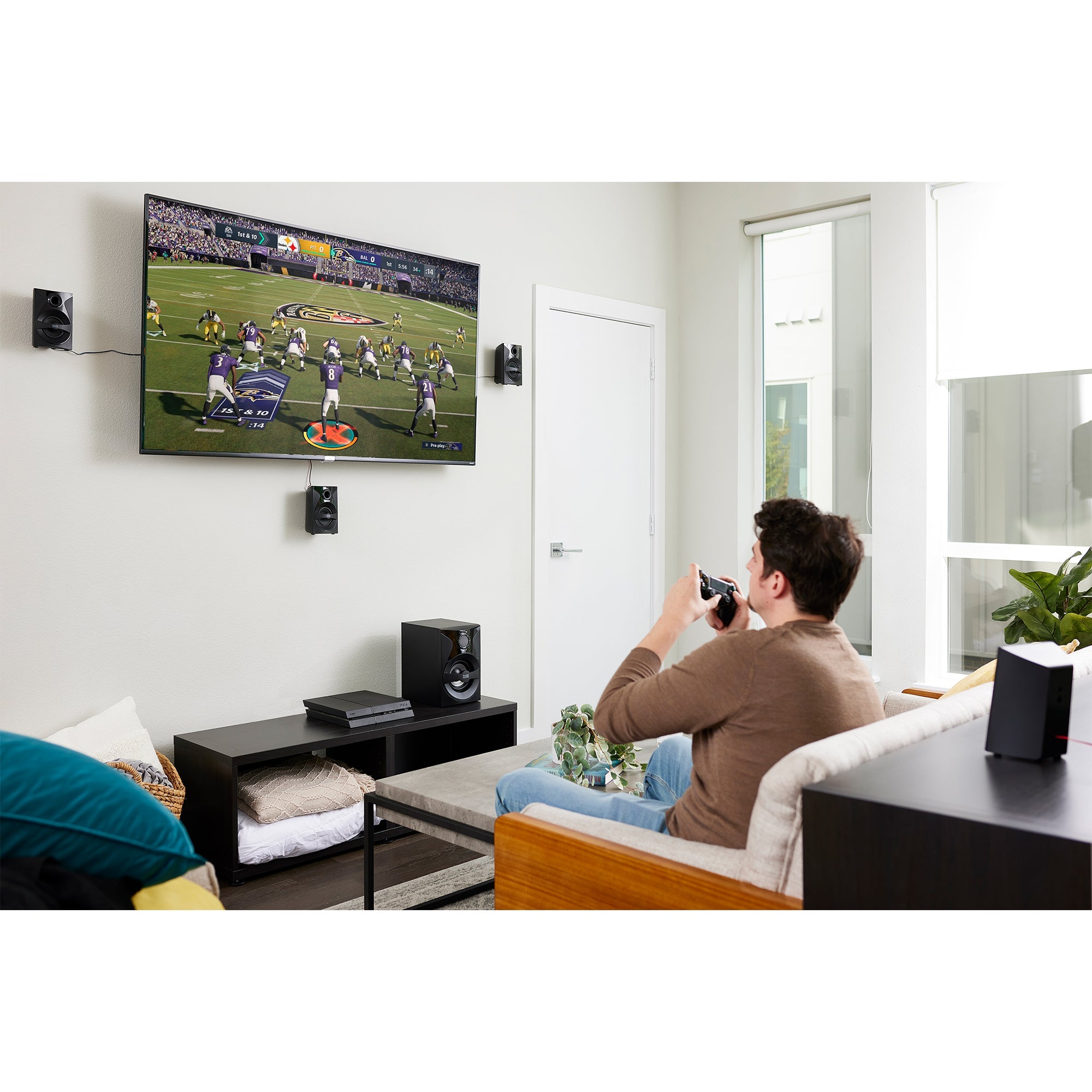 This speaker system comes with 5 wired satellite speakers and 1 subwoofer speaker, immersing you with sound when you watch TV, game, or stream music. Each sound system has an integrated power amp with 300 Watts of power. LED illuminated subs display multi-colored lights that flash in different patterns. Connect external surround sound speakers to create a cinema-style media experience in your living room. Bluetooth wireless receiver ability is compatible with any standard 3.5-millimeter headphones, RCA stereo, or RCA 6 channel surround audio outputs. Perfect for your home entertainment system. This system also comes with full function remote, 305-millimeter to RCA cable, 3 RCA to RCA jack cables, and an instruction manual. Upgrade your home theater and take movies at home to new lengths.