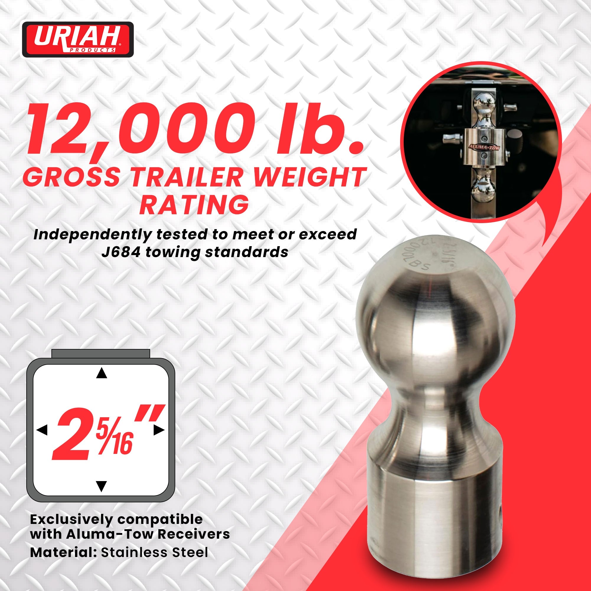 Exclusive to Aluma-Tow receivers, this replacement hitch ball seamlessly integrates with patented hitches, guaranteeing compatibility and optimal performance. Rest assured, the stainless steel construction remains impervious to corrosion, maintaining integrity and functionality through countless miles on the road. Boasting a gross trailer weight rating of 12,000 pounds for the 2-5/16-inch ball, this towing essential is ready to tackle even the most demanding towing tasks with ease. Each Aluma-Tow product undergoes rigorous independent testing to ensure compliance with or surpassing J684 towing standards, providing you with the utmost confidence in safety and reliability.