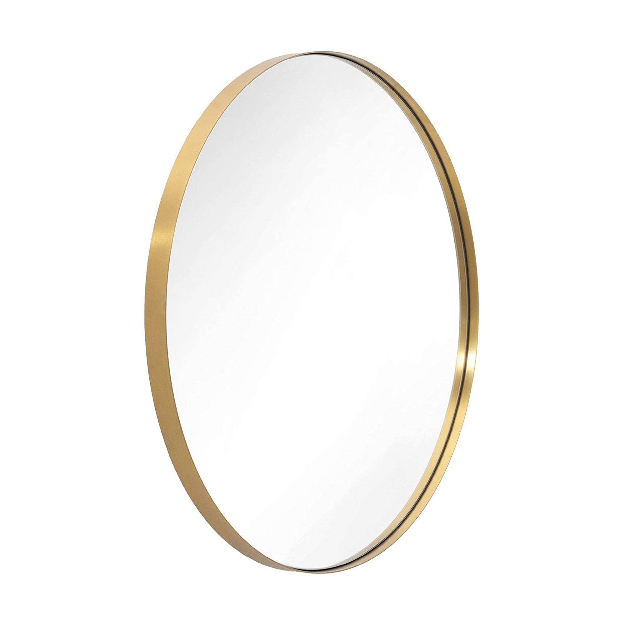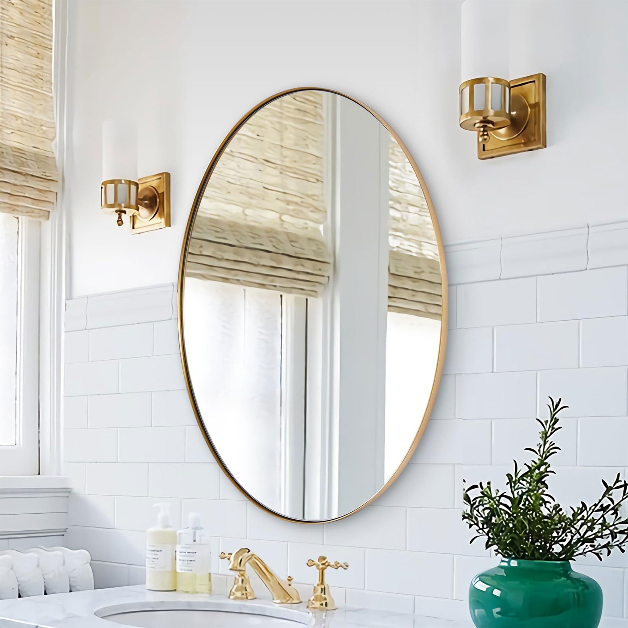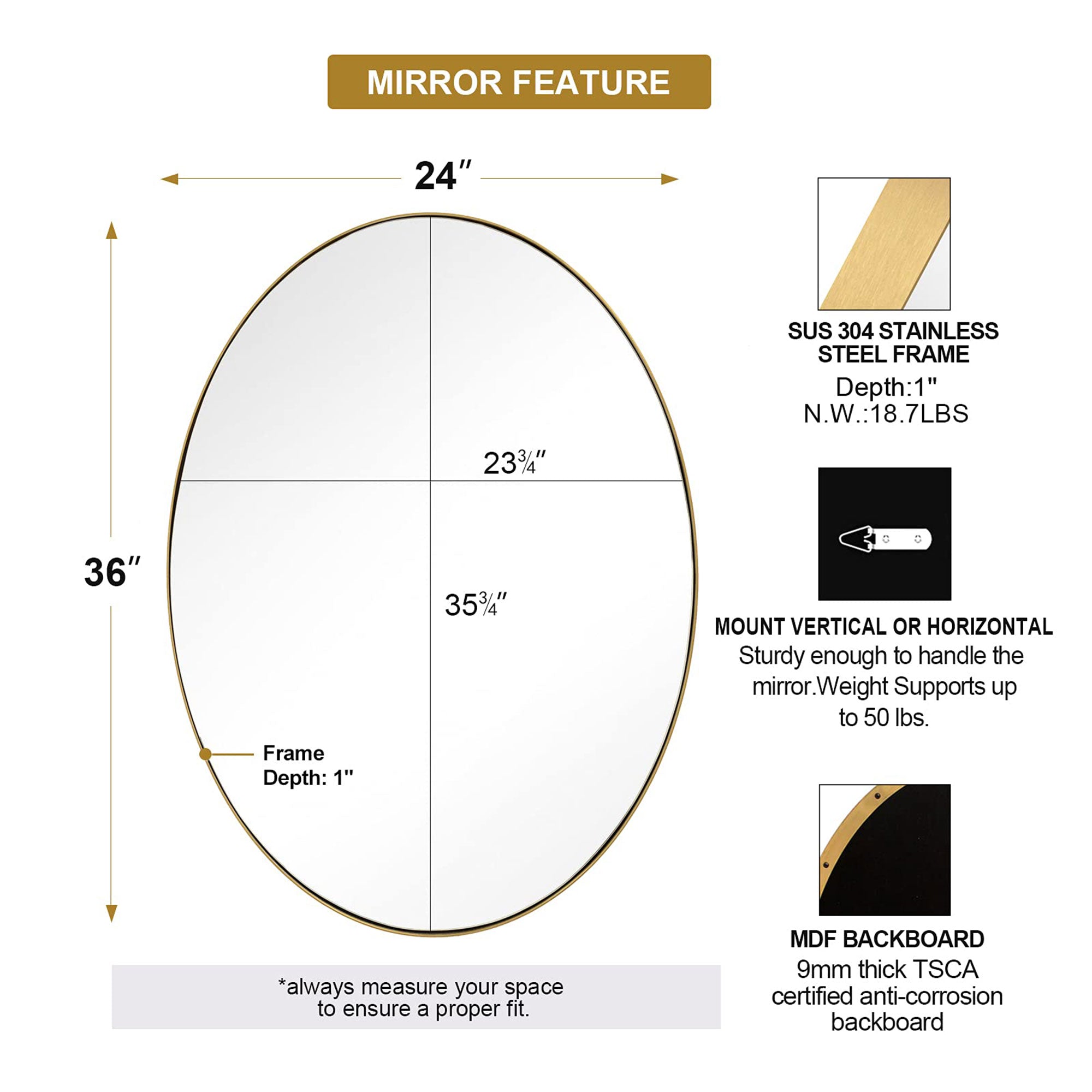 This oval-shaped mirror is sure to bring a sophisticated accent to any living area. Quality is in the details, from a refined brushed gold finish, precise linework, and the gap between the frame and glass. This mirror presents beautifully under high-definition floating glass and medium-density fiberboard with no visual distortion. A broad oval shape offers increased vertical visibility so you can get an unobscured look at your reflection before the day begins. The heavy-duty, 2-millimeter stainless steel frame with multiple layers of waterproofing allows for a luxury appearance boasting long-lasting durability. This modern hanging mirror is rated for use in the bathroom, fireplace, entryway, living room, and other high-moisture areas.