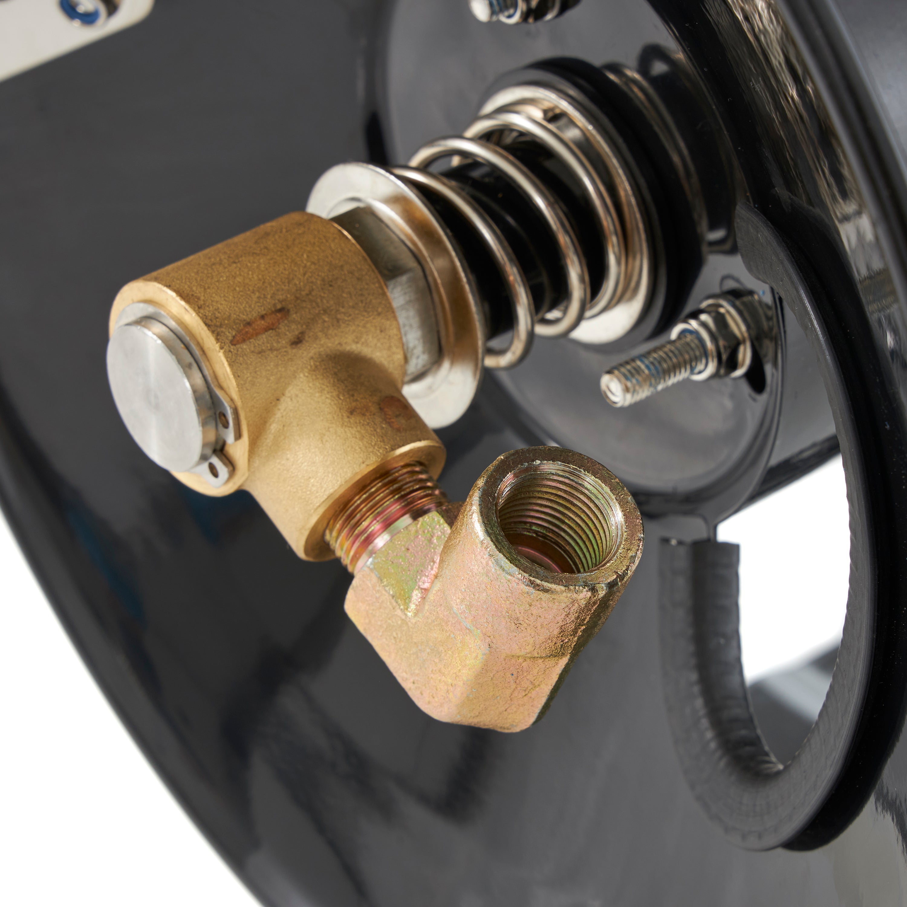Holding up to 50 feet of 0.38-inch wide hose on the wheel, the reel allows you to stow away your washer's hose once the job is finished. Removing the need to wrap up the hose, the reel helps keep your garage or shed neat and organized so you never trip over a messy hose. The durable, stainless steel design resists weathering and damage with a strong black powder-coat finish.