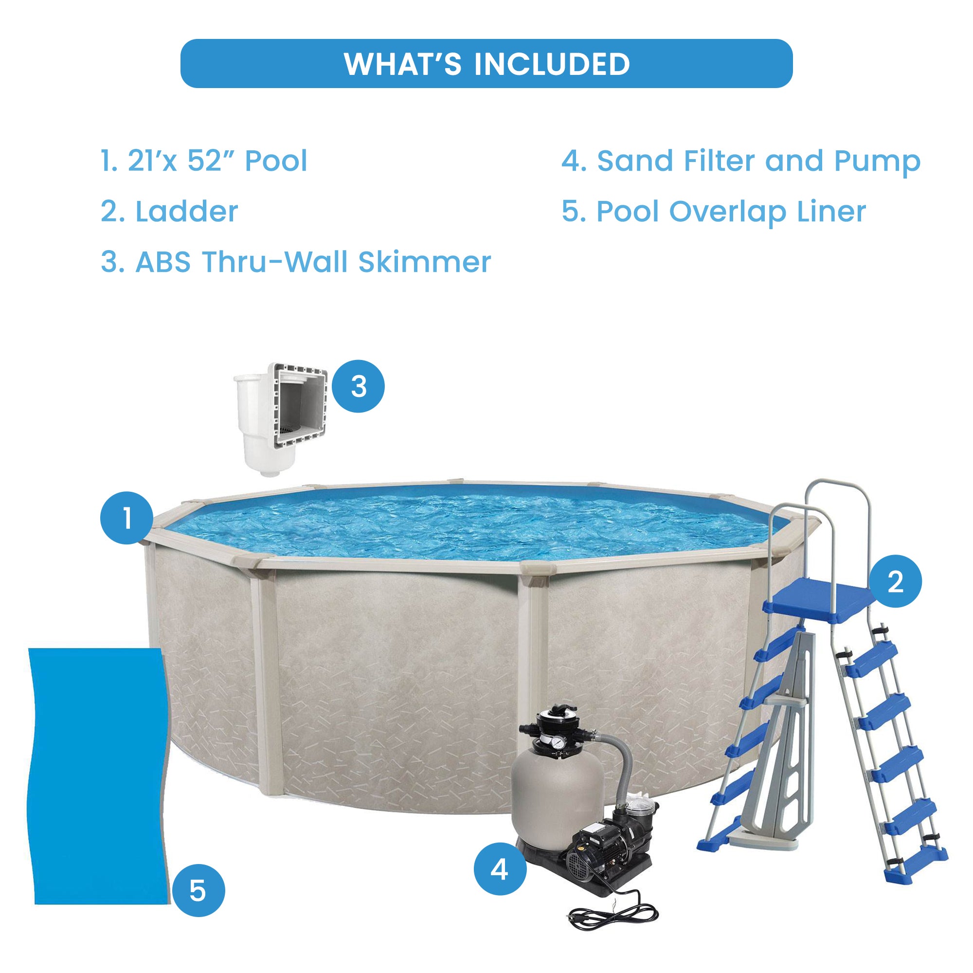- Aquarian Pools Phoenix 21 foot x 52-inch Steel Above Ground Pool package with sand filter pump, ladder, liner and skimmer