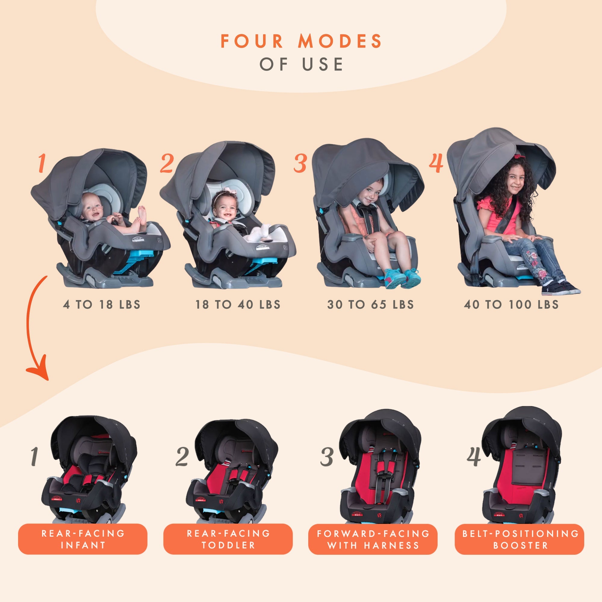 - Can accommodate 4 to 100 pounds; Offers 4 unique modes: rear-facing infant, rear-facing toddler, forward-facing toddler, and belt-positioning booster