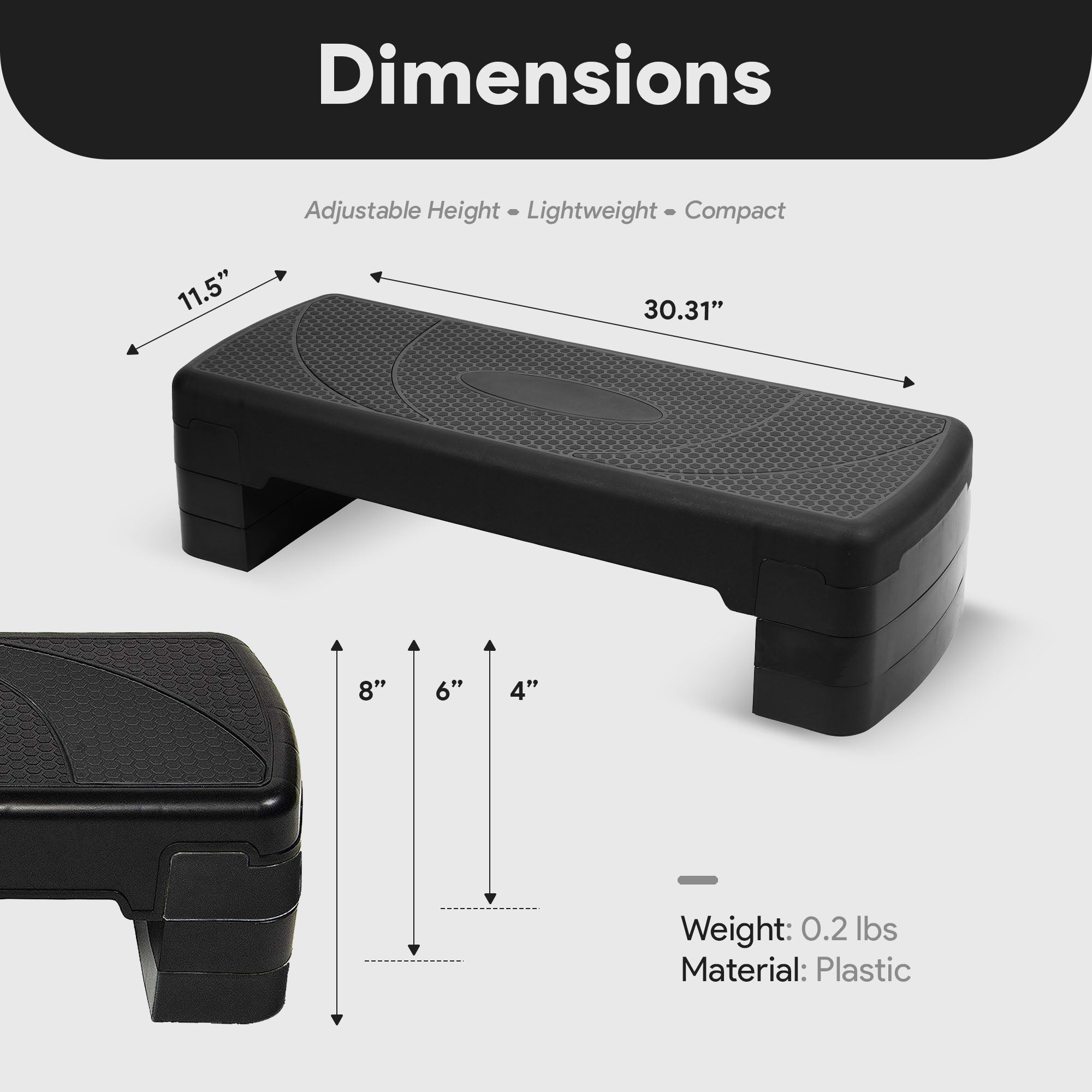 Crafted with durable ABS material, this stepper is built to last, making it a reliable companion for your fitness journey. The textured non-slip surface ensures stability and safety during each step, push-up, and routine, while the shock-absorbing feature minimizes impact on your joints. Measuring 31 by 11.5 inches, this platform offers ample space for various exercises with height adjustability that customizes your fitness session to your liking. Use the included feet to adjust the platform height to 4 inches, 6 inches, or 8 inches tall by simply attaching them to the platform's base. It's lightweight and easy to carry, assemble, and store, making it a practical addition to your home gym or fitness space.