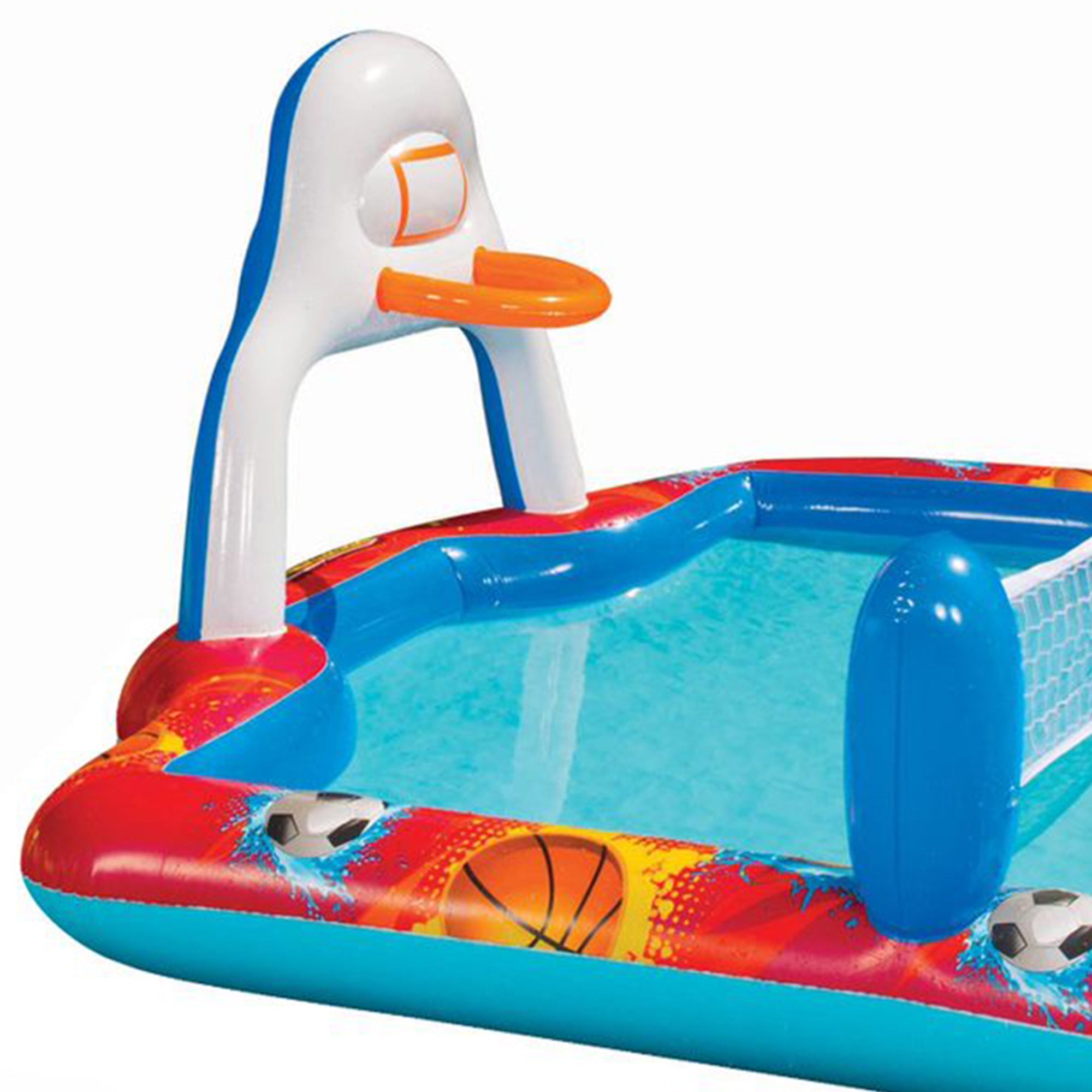 • Interactive 4-in-1 water park pool allows kids to play water polo, soccer, volleyball, or shoot hoops for hours of entertainment