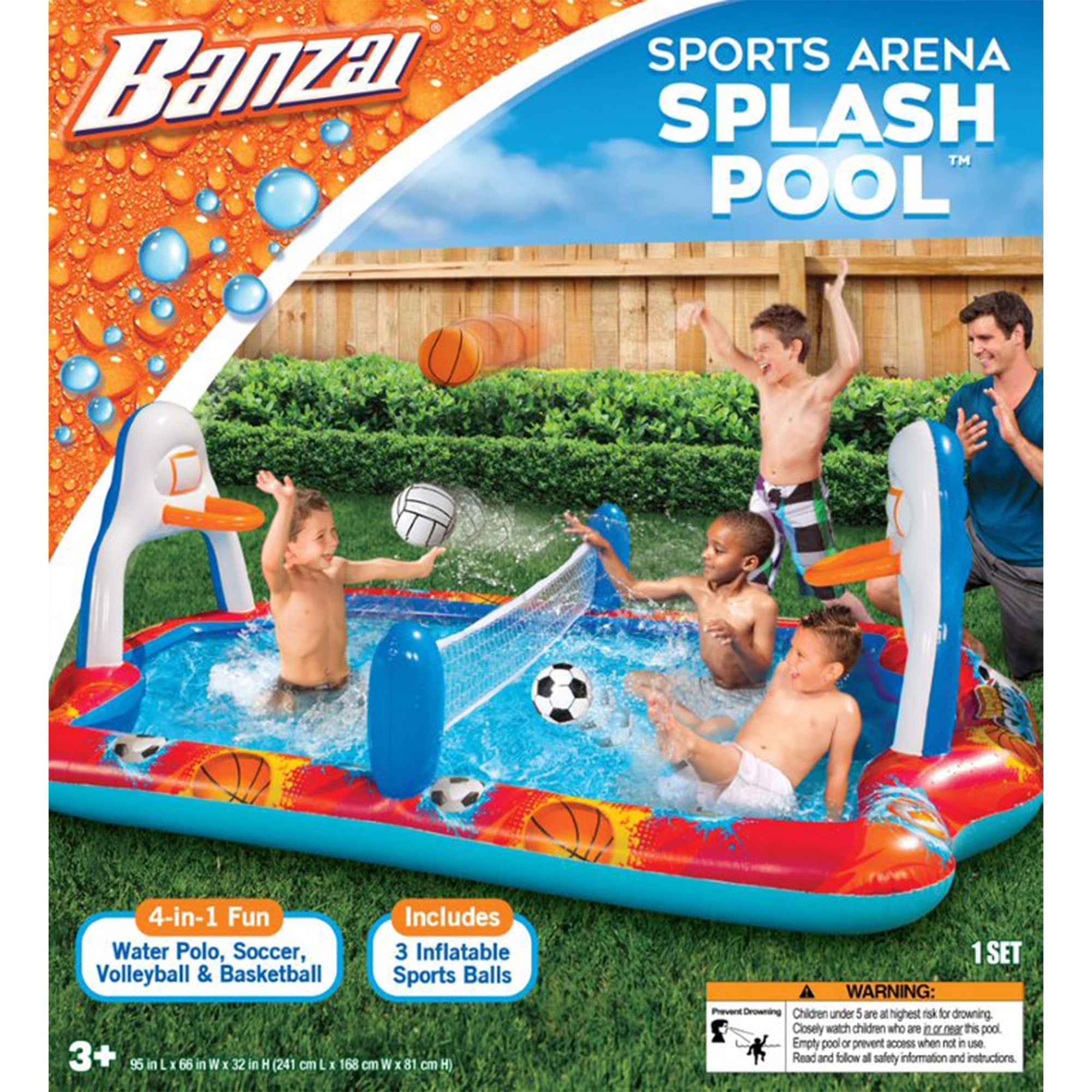 Your kids will have endless hours of active fun with the Banzai Outdoor Inflatable Sports Arena 4-In-1 Play Center Pool. Kids can play water polo, soccer, volleyball, or shoot hoops with this interactive 4-in-1 play pool.