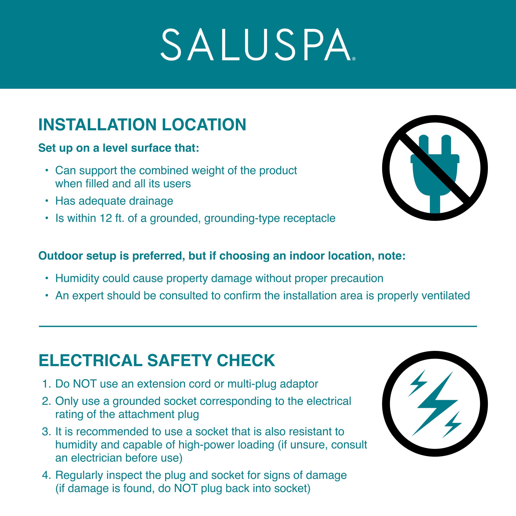 - ELECTRICAL SAFETY: Do NOT use an extension cord or multi-plug adaptor; plug the hot tub directly into a grounded socket corresponding to the electrical rating of the attachment plug (110-120V AC, 60Hz, Single Phase 12A at 68ºF). Outdoor installation is preferred; indoor installation has special requirements