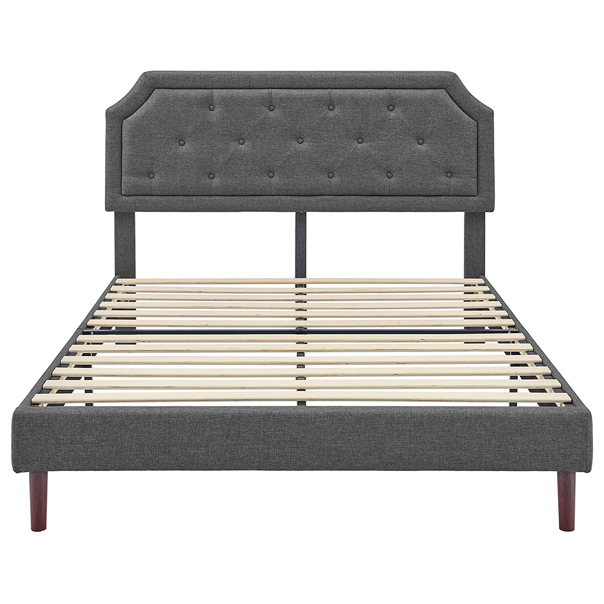 - Linen-based fabric upholstery with curved, button-tufted headboard adds modern elegance to any bedroom